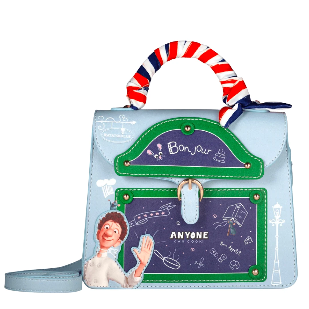 Inspired by the chic streets of Paris, the Danielle Nicole Ratatouille Receipt Satchel has arrived. A primary color scheme with pops of green, featuring a “Bonjour” Remy and Linguine. The scarf-wrapped top handle mimics the colors of the French flag, so you can live out your Parisian dreams when wearing this statement piece. White sketch details add a playful cooking element to this crossbody, and the adjustable strap makes it easy to wear every day.
