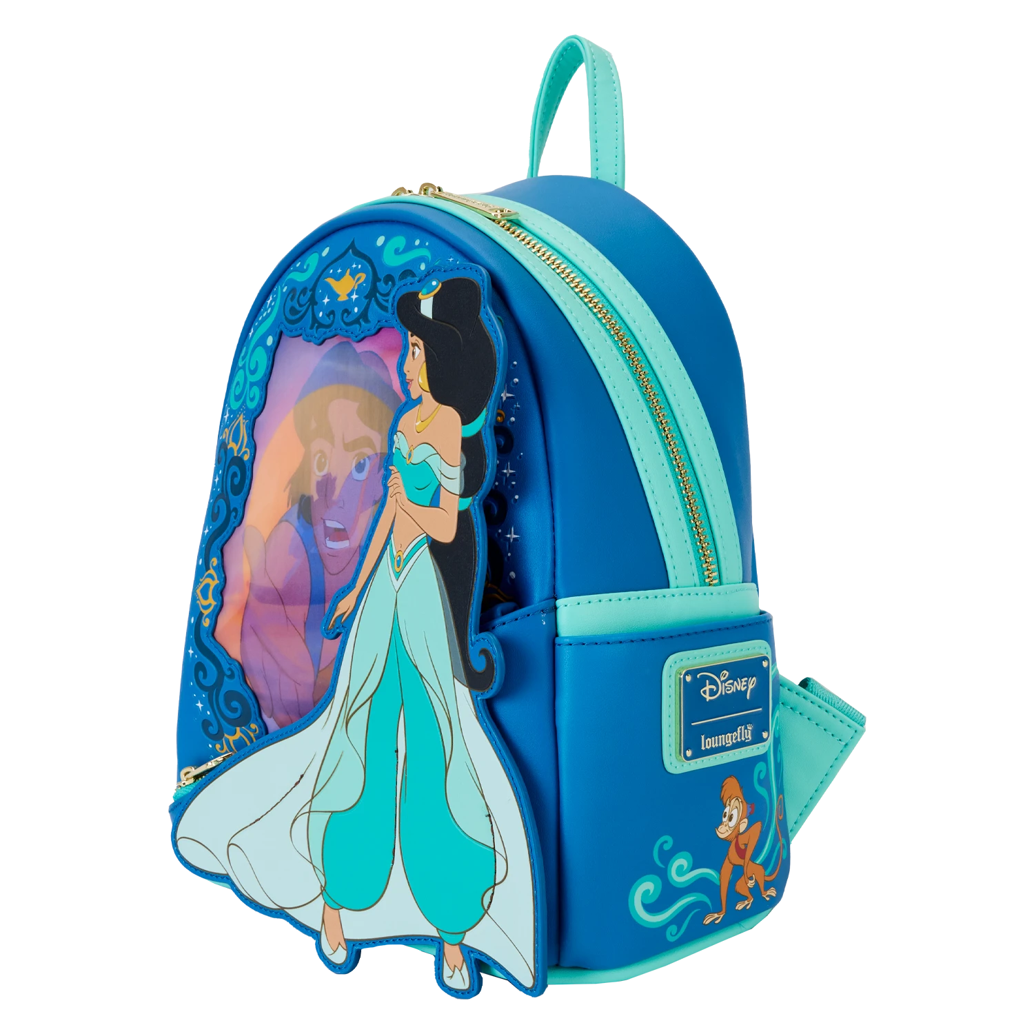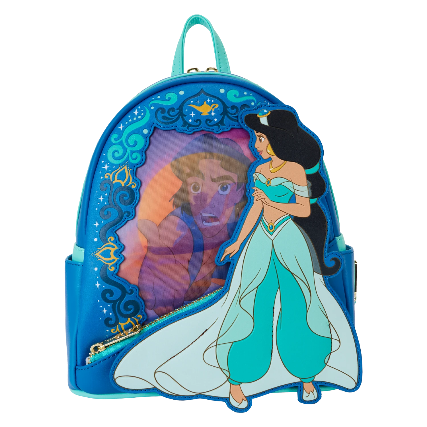 The Loungefly Princess Jasmine Lenticular Mini Backpack is made of vegan leather (polyurethane). Backpack has padded adjustable shoulder straps, side pockets, and gold-colored metal hardware. Additional features include applique, printed, lenticular, and debossed details. Take note of the coordinating inside lining.