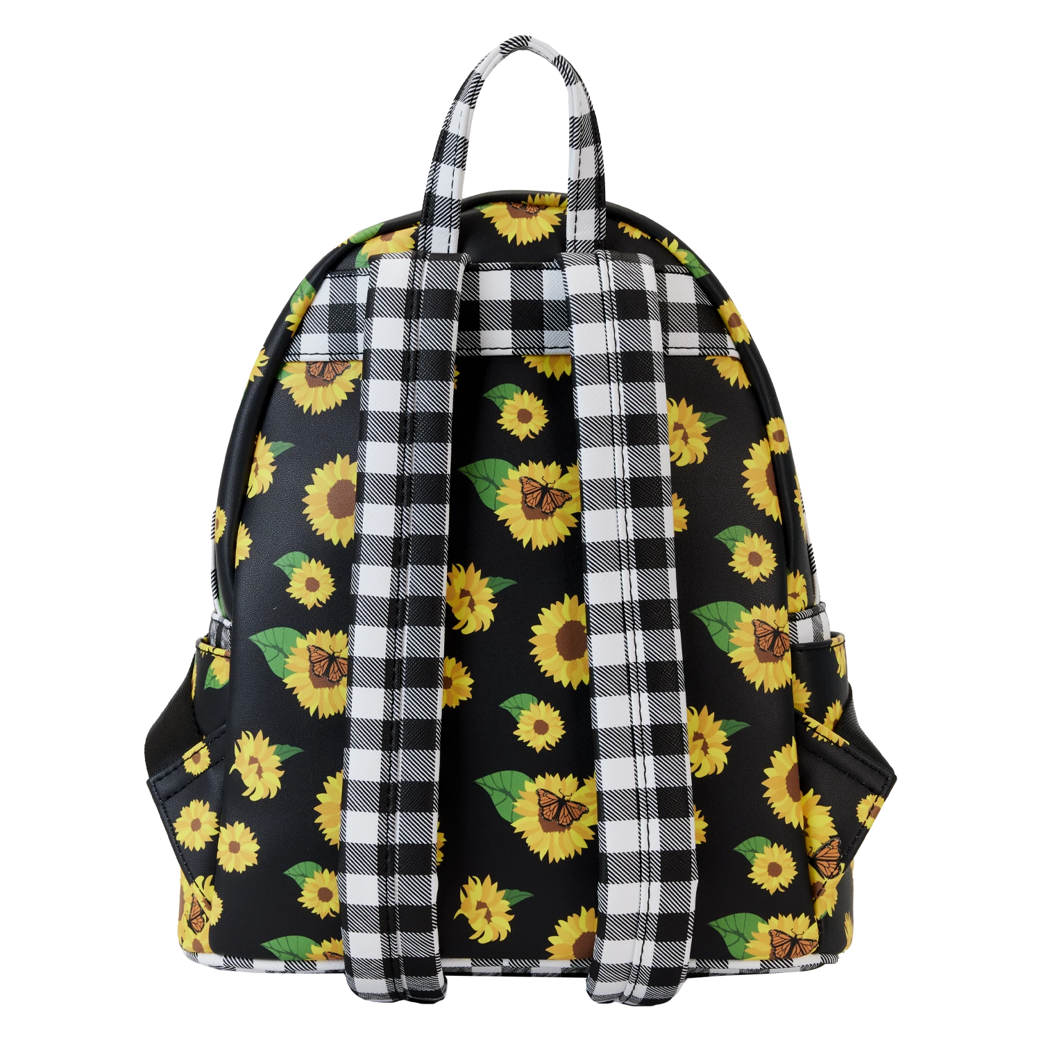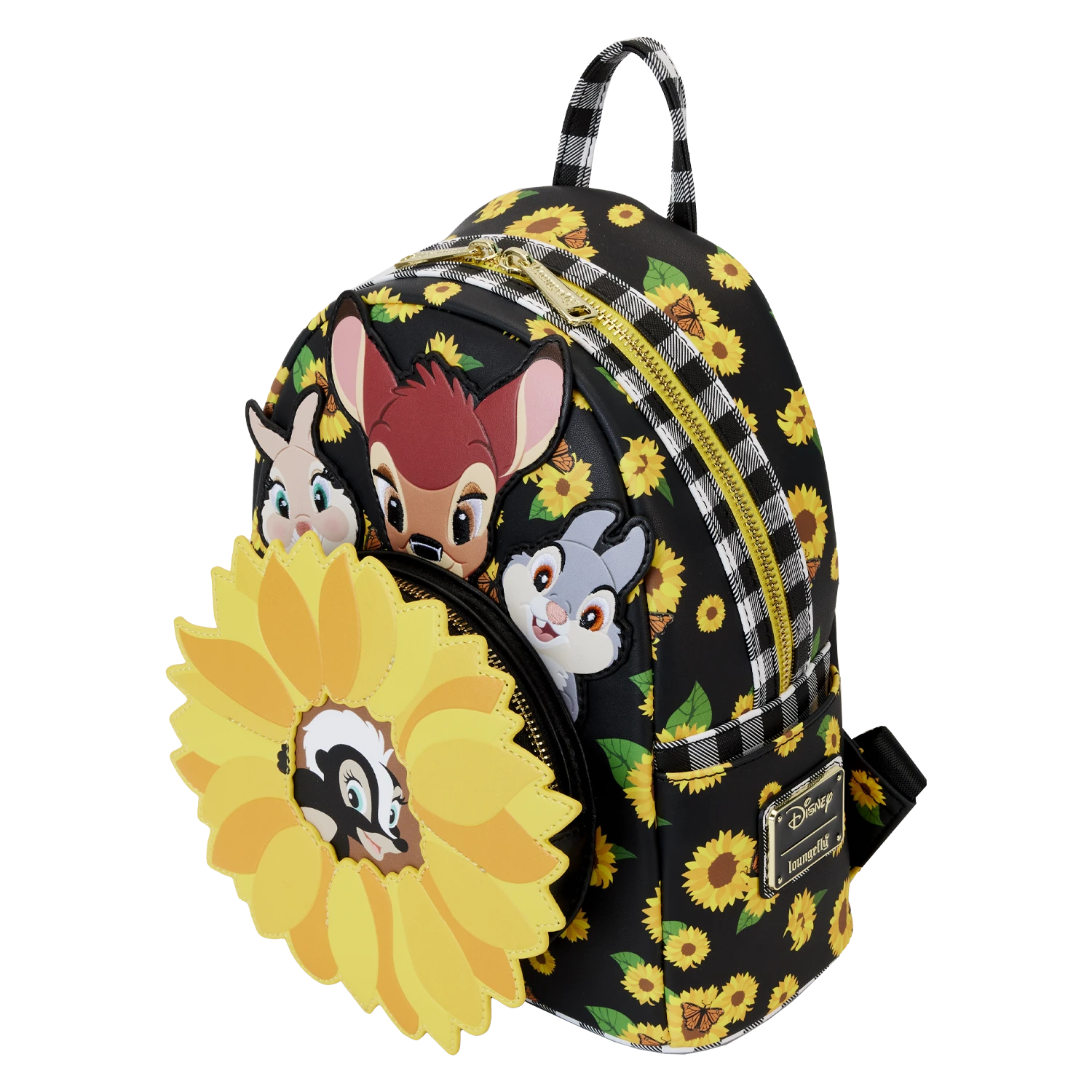 Time spent with friends simply feels like sunshine. Gather in the garden with the Loungefly Bambi Sunflower Friends Mini Backpack, where bright yellow sunflowers cover the bag in a cheerful all-over print. On the front, Bambi, Thumper, and Miss Bunny peek out from golden petals as a large sunflower takes shape on the front zipper pocket. Down below, Flower rests in the sunflower’s center. Black and white plaid trim adds a trendy note to the bag’s design and continues onto its adjustable shoulder straps. This mini backpack makes a radiant addition to any outfit and is perfect for fans looking to keep their favorite characters close.