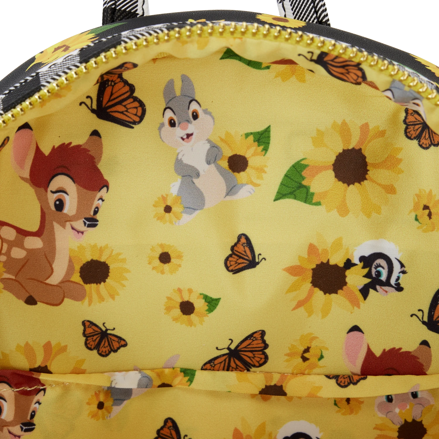 The Loungefly Bambi Sunflower Friends Mini Backpack is made of vegan leather (polyurethane). Bag has adjustable shoulder straps and shiny gold hardware. Additional features include applique, debossed, embroidered, and printed details. Take note of the coordinating inside lining.