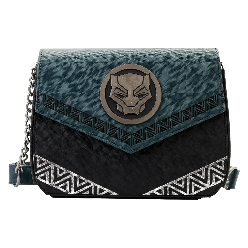 The Loungefly Black Panther: Wakanda Forever Crossbody Bag is made of vegan leather (polyurethane). Bag has adjustable chain shoulder strap (detachable) and sturdy metal hardware. Additional features include debossed and printed details. Take note of the coordinating inside lining.