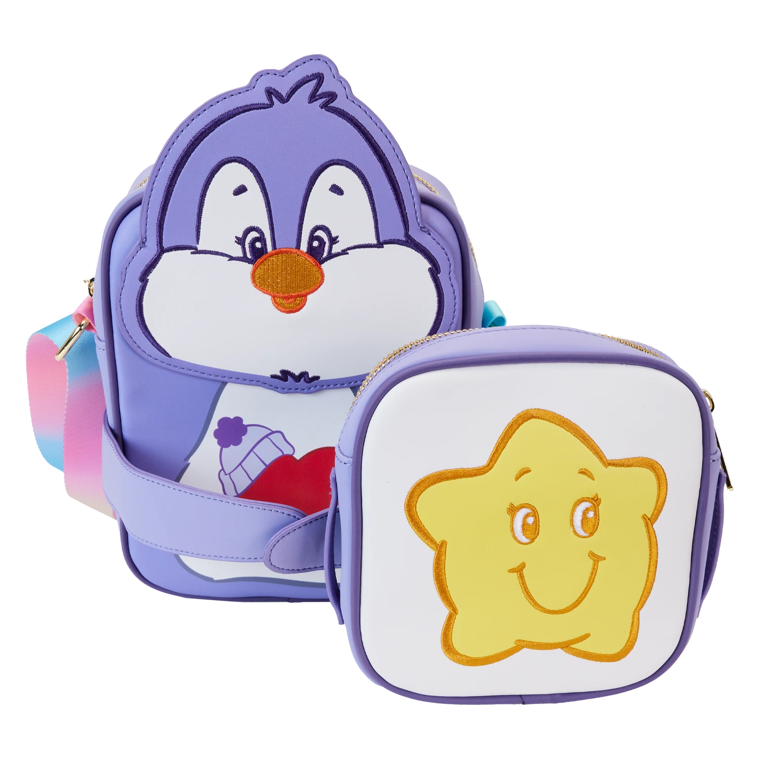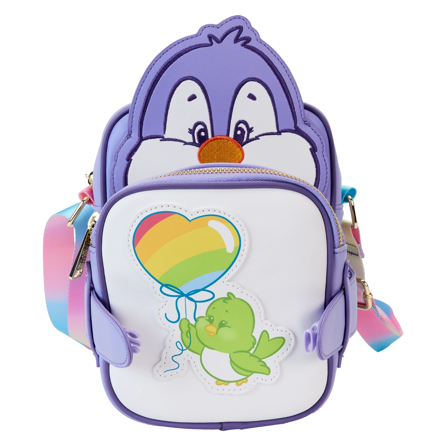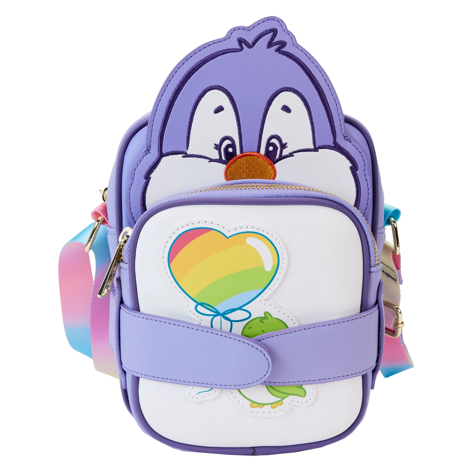 Journeying to Care-a-Lot™? Take along our Loungefly Care Bears™ Cousin Cozy Heart Penguin™ Crossbuddies™ Bag. This purple passport-style bag features Cozy Heart Penguin, whose applique face pops up over the top of this accessory with embroidered details. Cozy Heart Penguin’s applique arms clasp a coin pouch that is removable and reversible, so you can change up your look. On one side, you’ll see an applique print of a bird with a heart-shaped rainbow balloon. On the other side, you’ll find an applique print of an adorable smiling star. On the back, the signature Care Bears logo heart appears. Adjustable straps, in an ombre rainbow pattern, add convenience and a splash of color. Share a message of caring wherever you go with this delightful accessory.