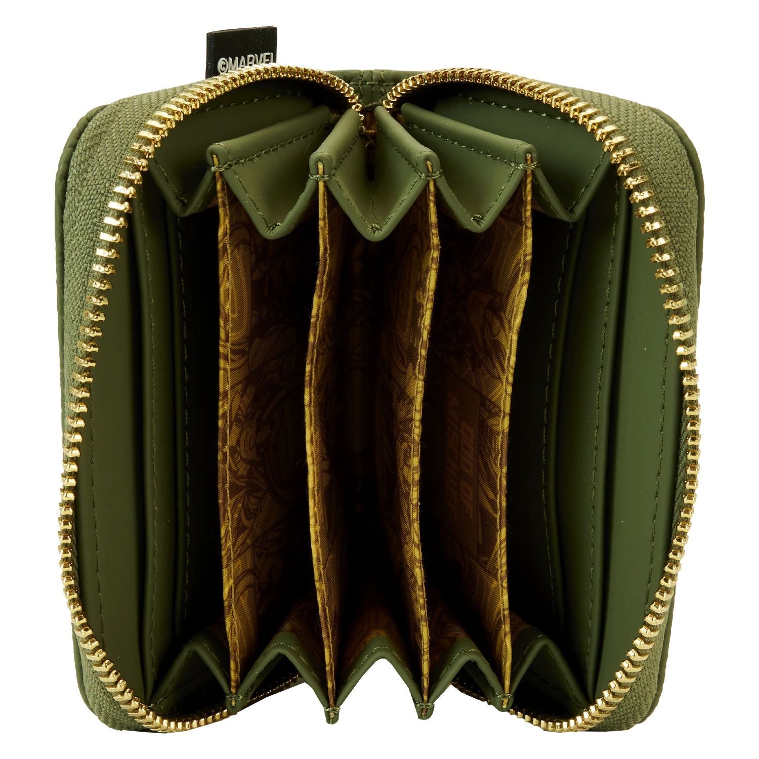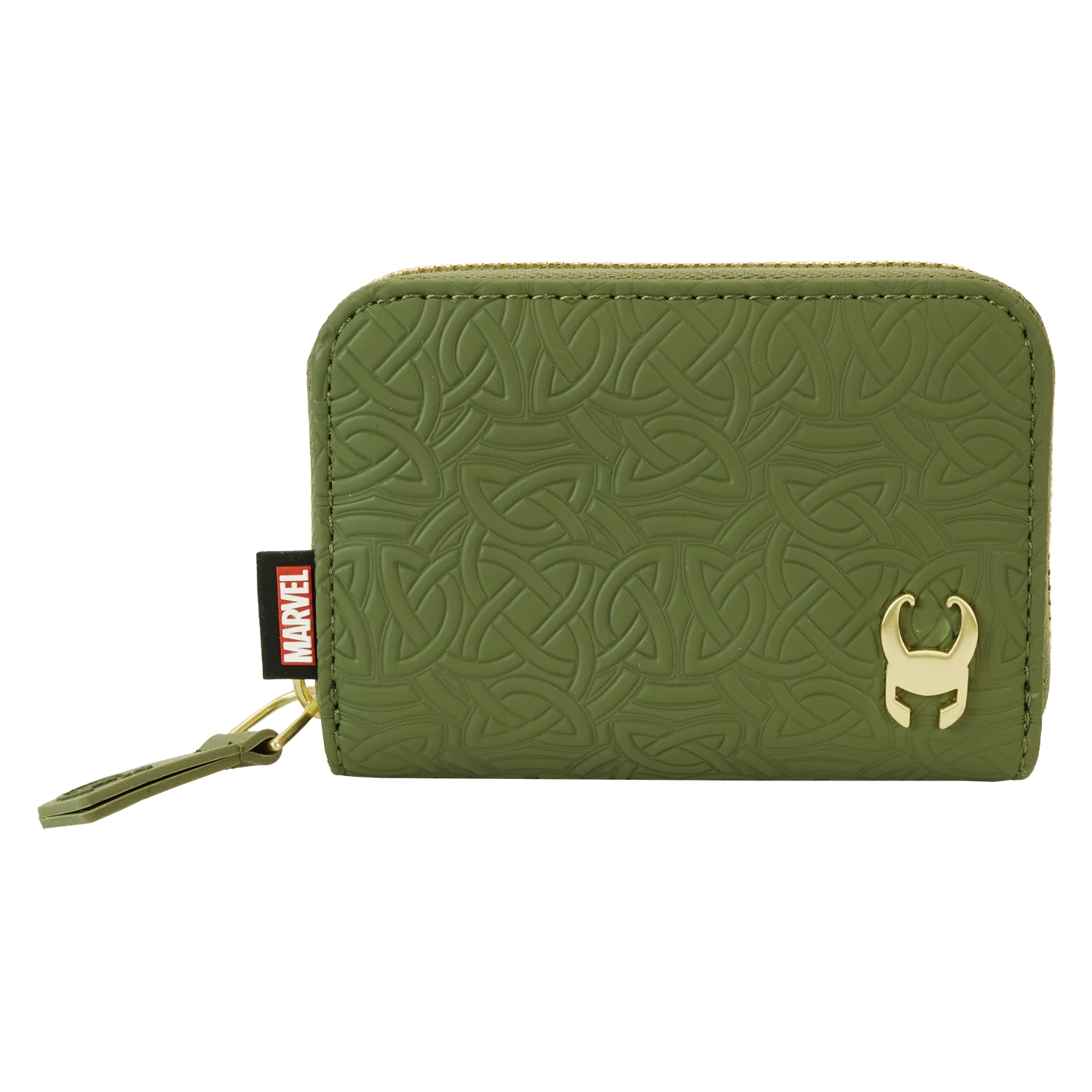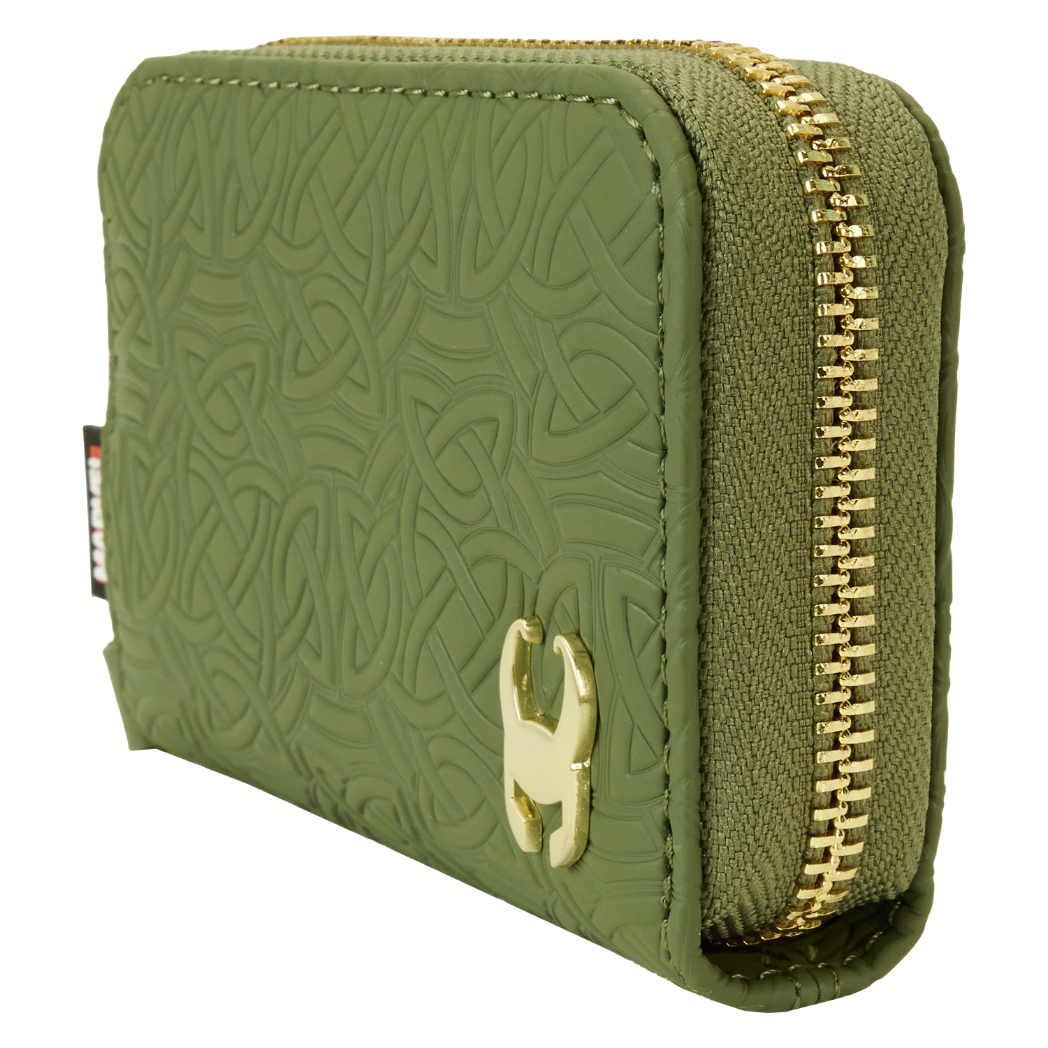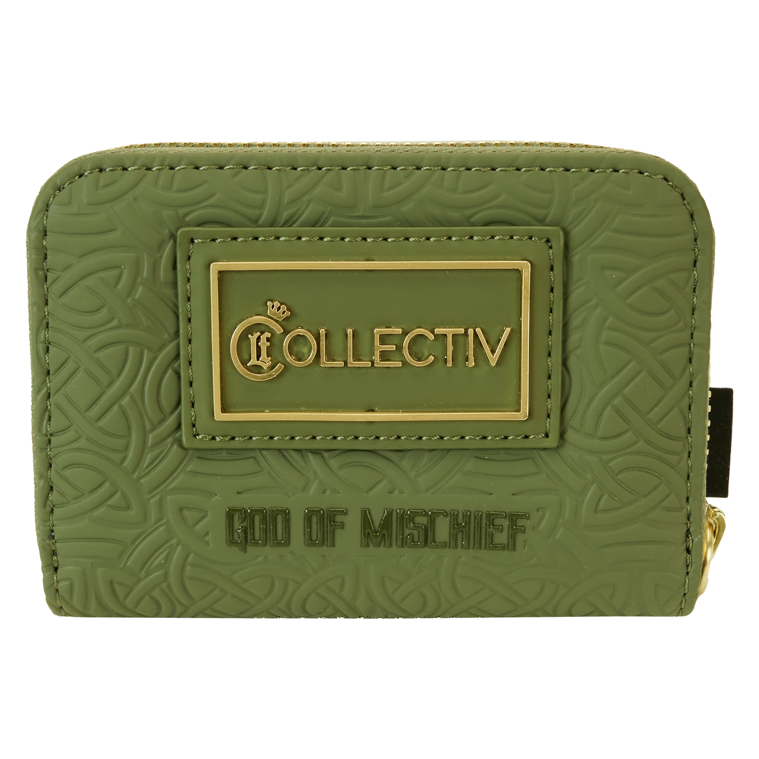 Slip away with a timeless look. The Loungefly COLLECTIV Loki The ORGANIZR Accordion Wallet offers a sleek travel option on any timeline. If you crave organization, this wallet holds your essentials in a neat, orderly fashion, while you celebrate your favorite fandom. A subtle green background serves as a canvas where intricate debossed patterns of Loki’s intertwining snake symbol repeat. A gold metal rivet adds an elegant touch, and on the back, raised silicone print spells out “God of Mischief.”