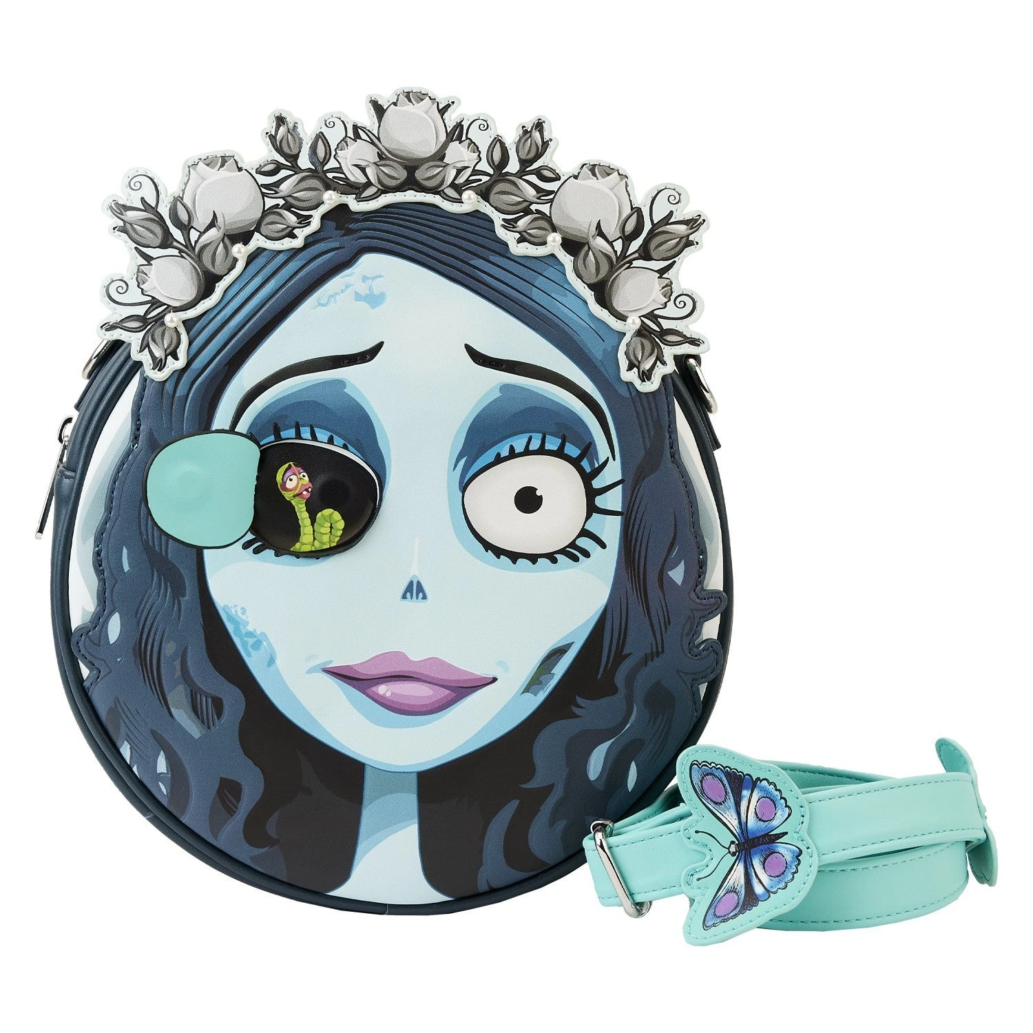 Follow the moonlight to the Land of the Living in style. Say, “I do” to our Loungefly Warner Bros. Corpse Bride Emily Crossbody Bag. This fully figural accessory is crawling with all kinds of fun details. On the front, Emily’s face comes to life in elegant applique detail. Her veil includes exquisite applique flowers and faux pearl decoration. Also, her right eye opens to reveal Maggot, who glows in the dark! For less “eye-opening” moments, a magnetic closure secures this hidden detail. On the back, details from Emily’s hair and intricate veil continue, and butterflies “flit” about the straps. Get carried away in spellbinding style with this hauntingly beautiful accessory.