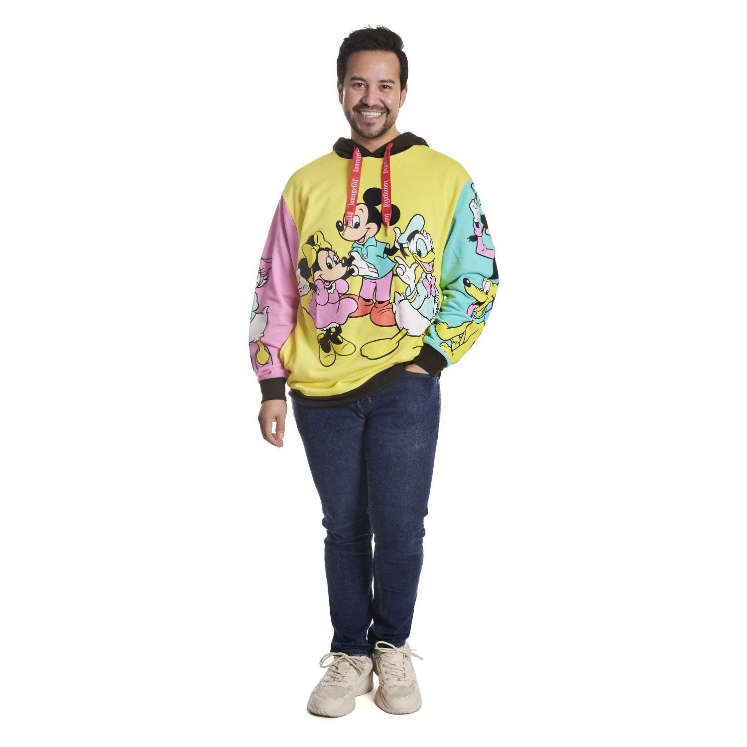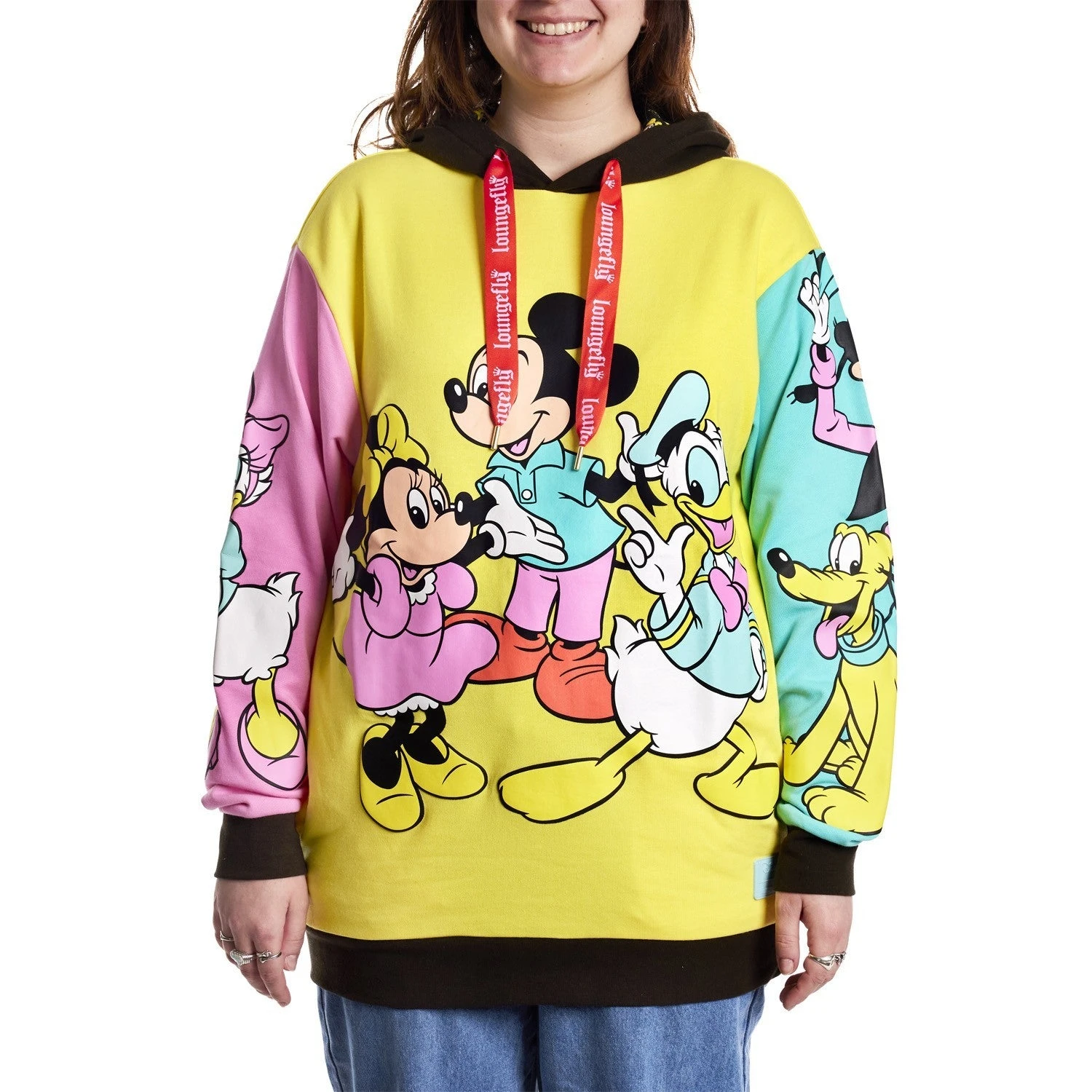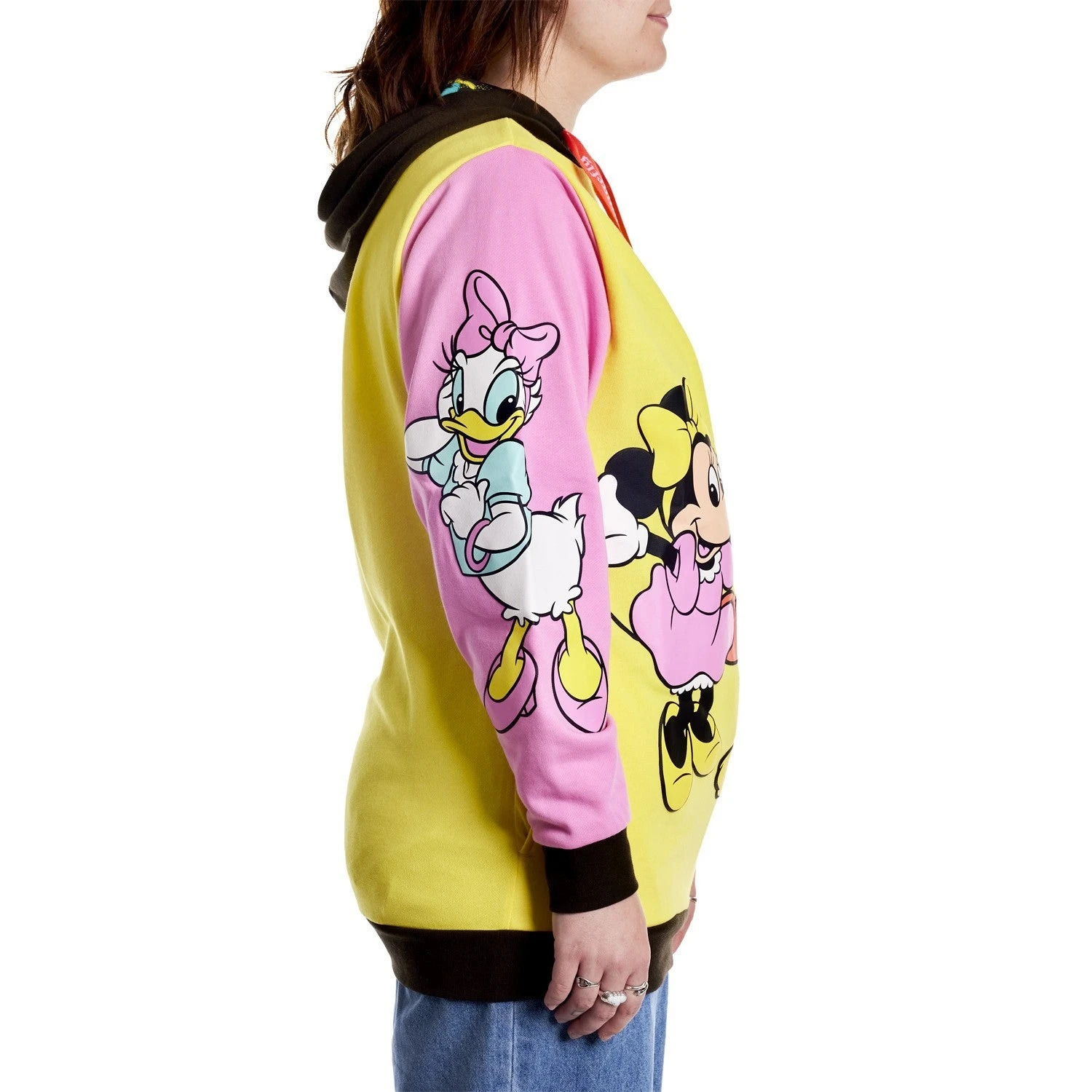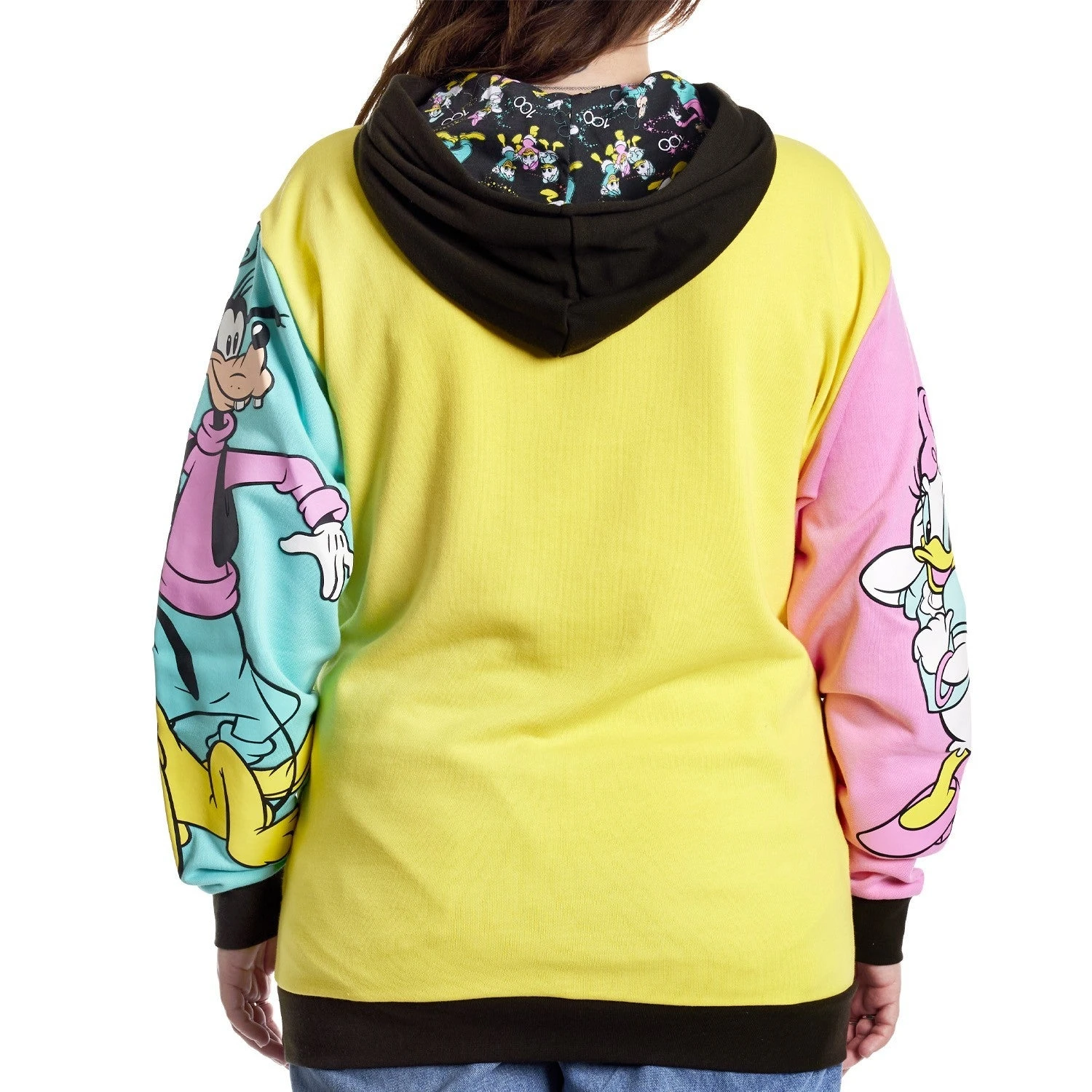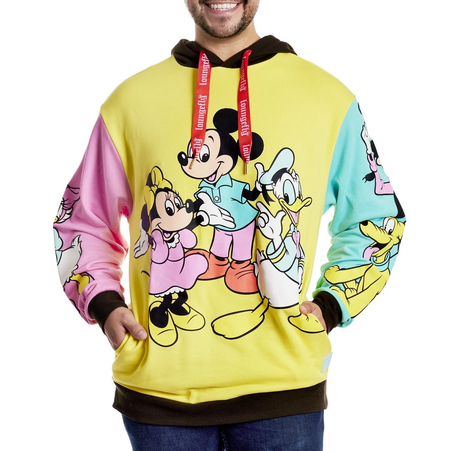 Get ready to cheer, for the gang’s all here! Bring the celebration wherever you go with our D100 Mickey Mouse and Friends Hoodie. This color-block hoodie features three bright blocks of color and your favorite characters, done up in fun, puffy ink. In yellow, on the front, you’ll find Mickey Mouse, Minnie Mouse, and Donald Duck. On one sleeve, in pink, Daisy Duck appears, and on the other sleeve, in teal blue, Goofy and Pluto say hello. Cozy side pockets are perfect for warming your hands between waving to the crowds. Step out with a little bit of character and celebrate in style.