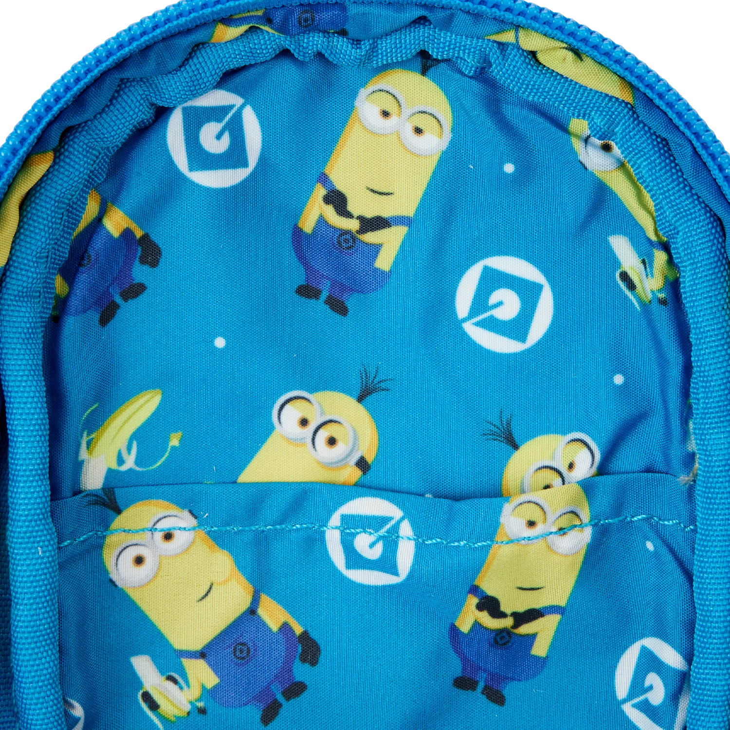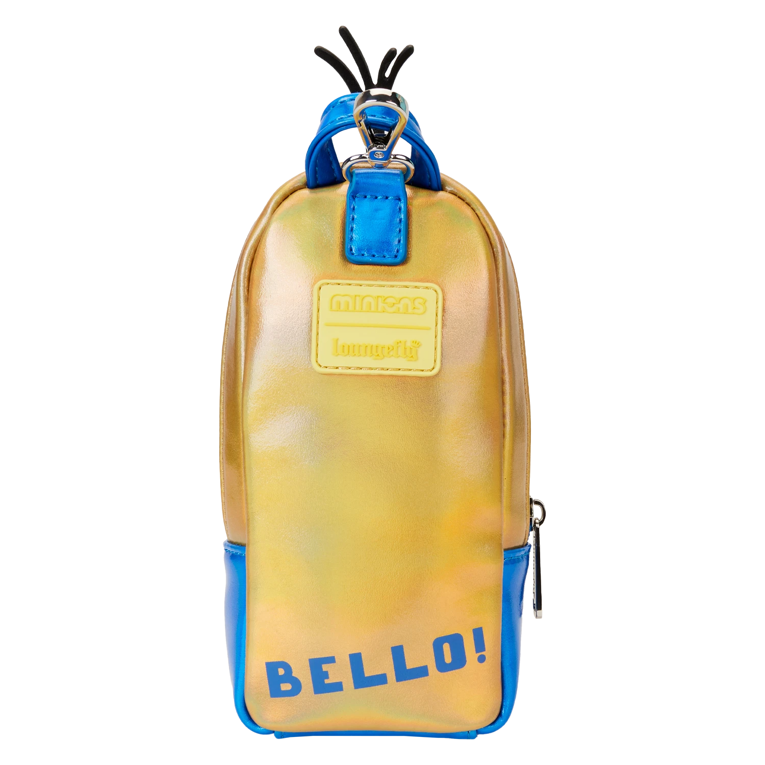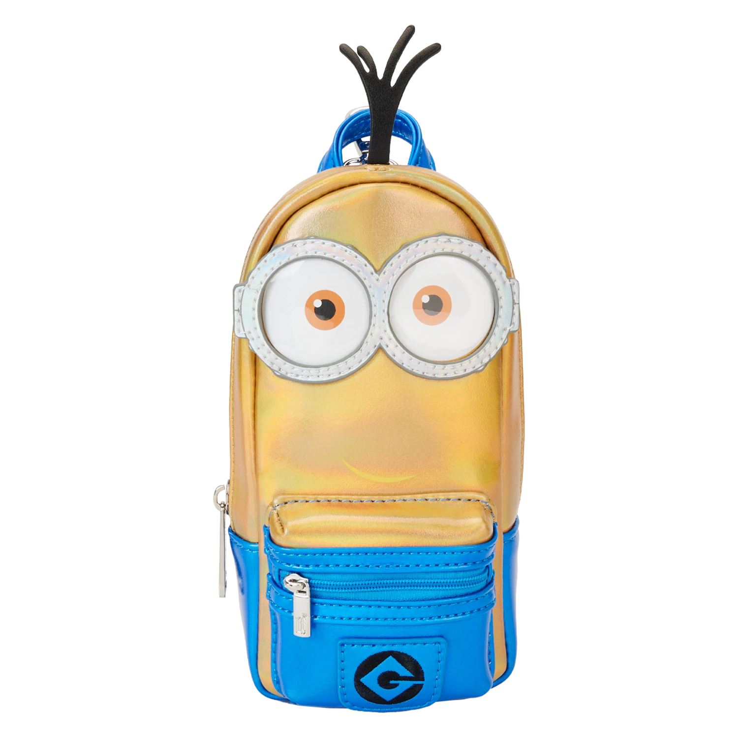 Writing an ode to your favorite Minions—and bananas? Express yourself and keep all your inspirational tools organized with our Minions mini backpack pencil case. The front cover features a Minion in shiny gold and blue iridescent details. His applique glasses are framed in silver vegan leather, and clear PVC material creates see-through “lenses.” Even his hair sticks up at the top! A front “pocket” displays the “Gru” symbol in blue. On the back, you’ll find the word “Bello!” An extra zipper compartment in the front makes it easy to store and secure even smaller items, such as thumb drives or erasers. At the top, a clip adds convenience and versatility, as you can attach keychains or favorite charms. Have fun recording all the good-natured mischievous moments you encounter on your journeys, in style.