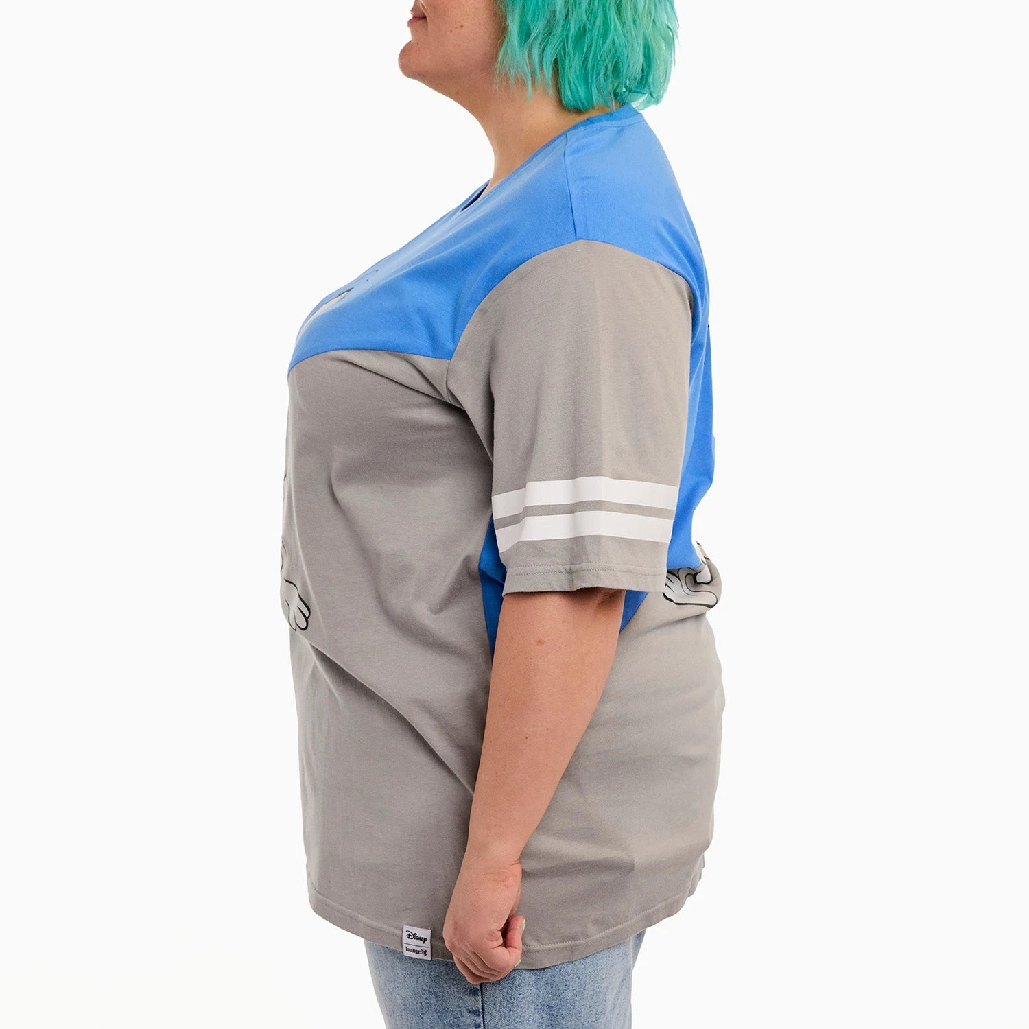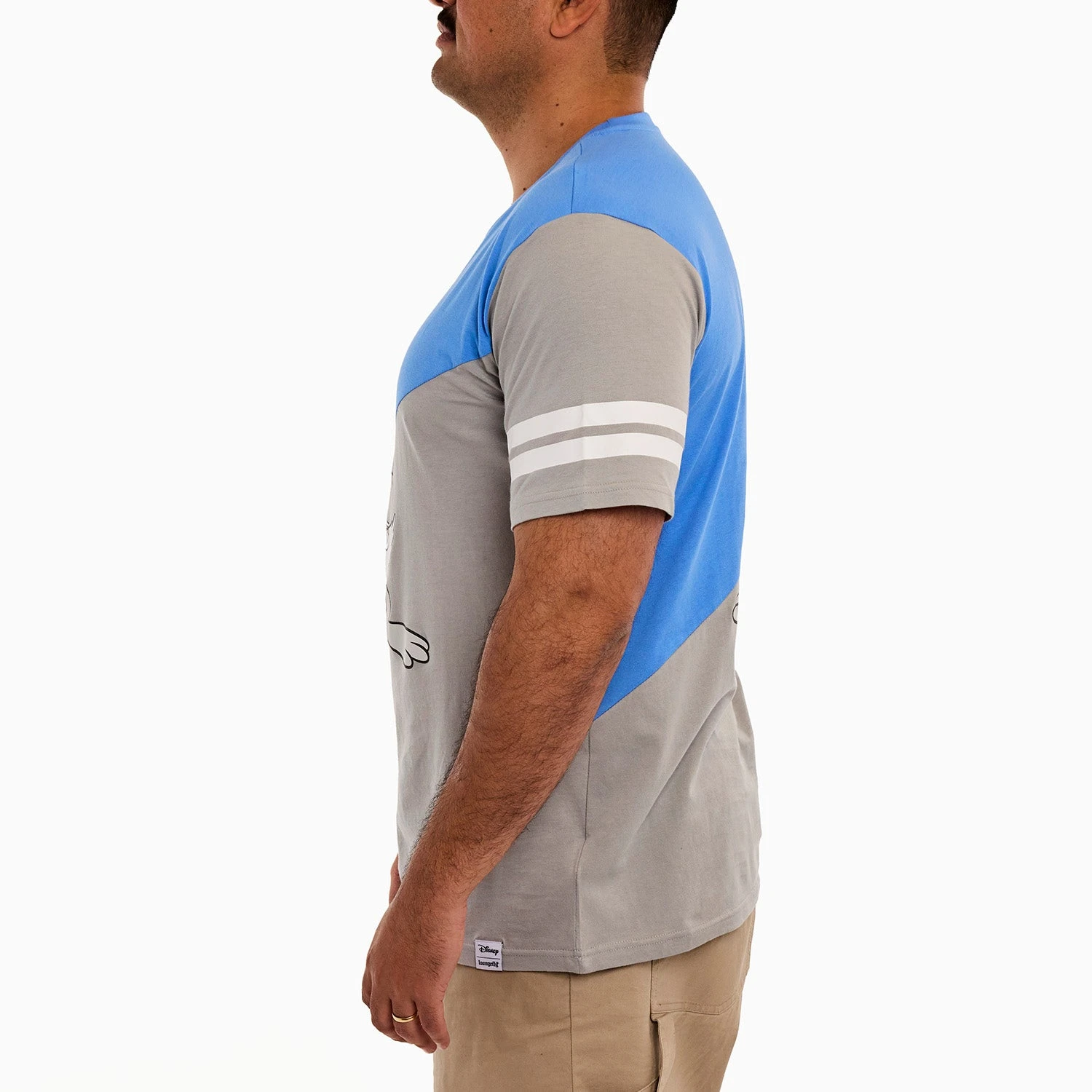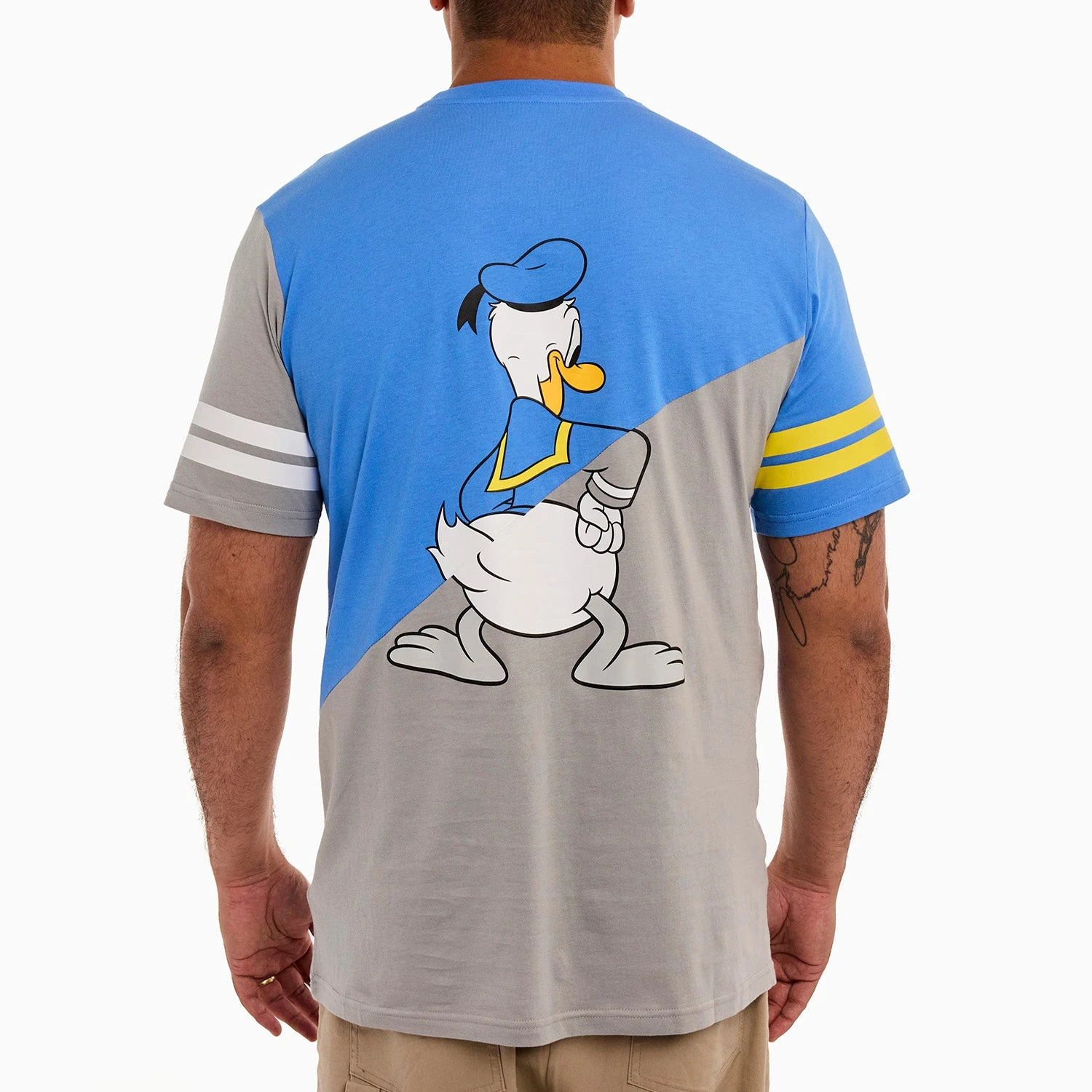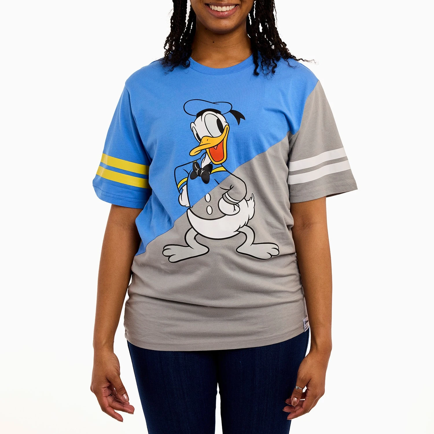 Head out to sea in great company! Gather your crew and set sail in style. This commemorative, crewneck, short-sleeved shirt features Disney’s Donald Duck in both grayscale and in color. The color scheme for this tee shirt splits on a diagonal so that the upper half of Donald Duck is in color, and the lower half is in grayscale. One sleeve carries a grayscale print with white stripes, and the other is in color, with yellow stripes. The artwork continues on the back, where you’ll encounter a tail-feathered view of Donald Duck in the same diagonal split of color and grayscale. Make waves while celebrating Donald Duck’s 90th anniversary in character.
