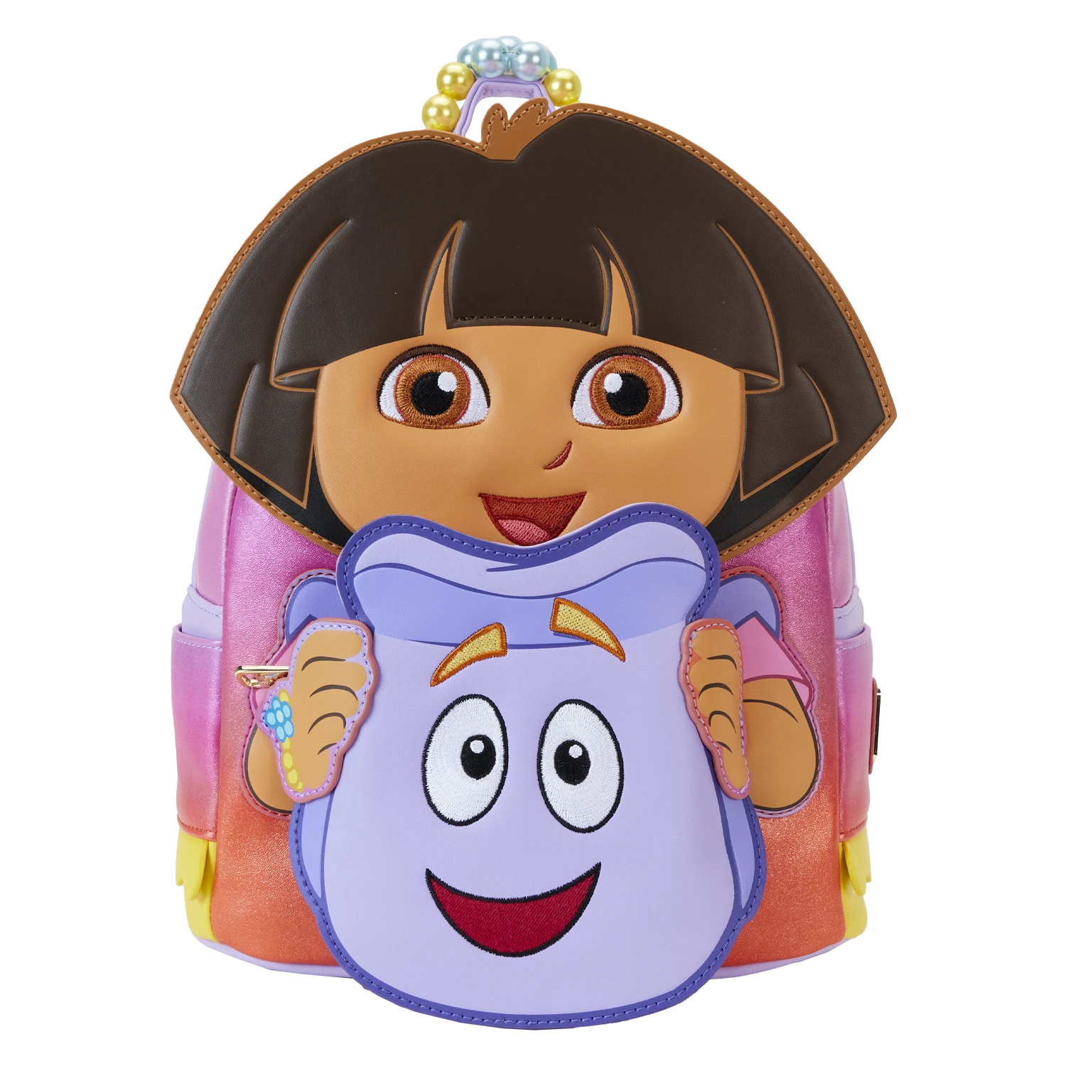 ¡Vámonos! Lead the way with our Loungefly Dora the Explorer Backpack Cosplay Mini Backpack. This fun backpack features none other than Dora’s own Backpack! Get ready to explore all kinds of fun places. Dora’s adorable face pops up over the top of this accessory, and she’s carrying Backpack. A hidden zipper compartment behind Backpack allows you to secure smaller items on your journeys. Embroidery makes Dora’s and Backpack’s facial features come to life. This accessory is colorful, too—covered in shimmery faux leather. On the side pockets, yellow applique ruffles add character. At the top, the handle features colorful molded beads. On the back, Dora makes an encore appearance as a print. She’s dashing off with Backpack, and the words above her read, ¡Hola! ¡Soy Dora! Pack just what you need for the day to take off on all kinds of adventures.