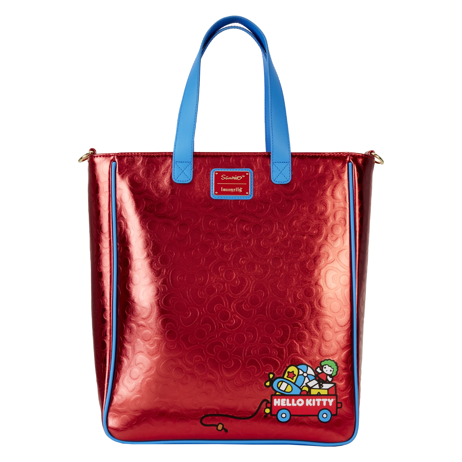 Wave hello wherever you go! Have fun expanding your circle of friends with our Loungefly Sanrio Hello Kitty 50th Anniversary Metallic Tote Bag with Coin Bag. This tote bag shimmers with metallic red material on all sides. A debossed pattern of Hello Kitty’s bow creates a cheerful, intricate pattern. On the front, Hello Kitty says, “Hi.” She’s making an appearance as a chenille patch, and she’s holding a teddy bear. All kinds of toys surround her, including a drum, rocking horse, tennis racket, and other surprises. The sturdy blue handle offers a pop of color, and on the back, you’ll find a printed wagon of a few more of her toys. The detachable coin bag is shaped like an apple and features red metallic material on the back with clear PVC material on the front. Here, Hello Kitty appears once more as a printed image, flying her plane. You can secure smaller items on all your journeys inside this sturdy, zipped compartment. Detachable and adjustable straps allow for versatility and convenience. Inside the tote, you’ll find various slots and compartments for storing and organizing the items you’ll need for the day. This roomy bag also zips at the top for extra security.