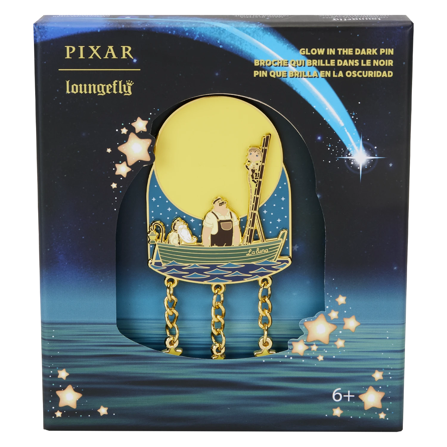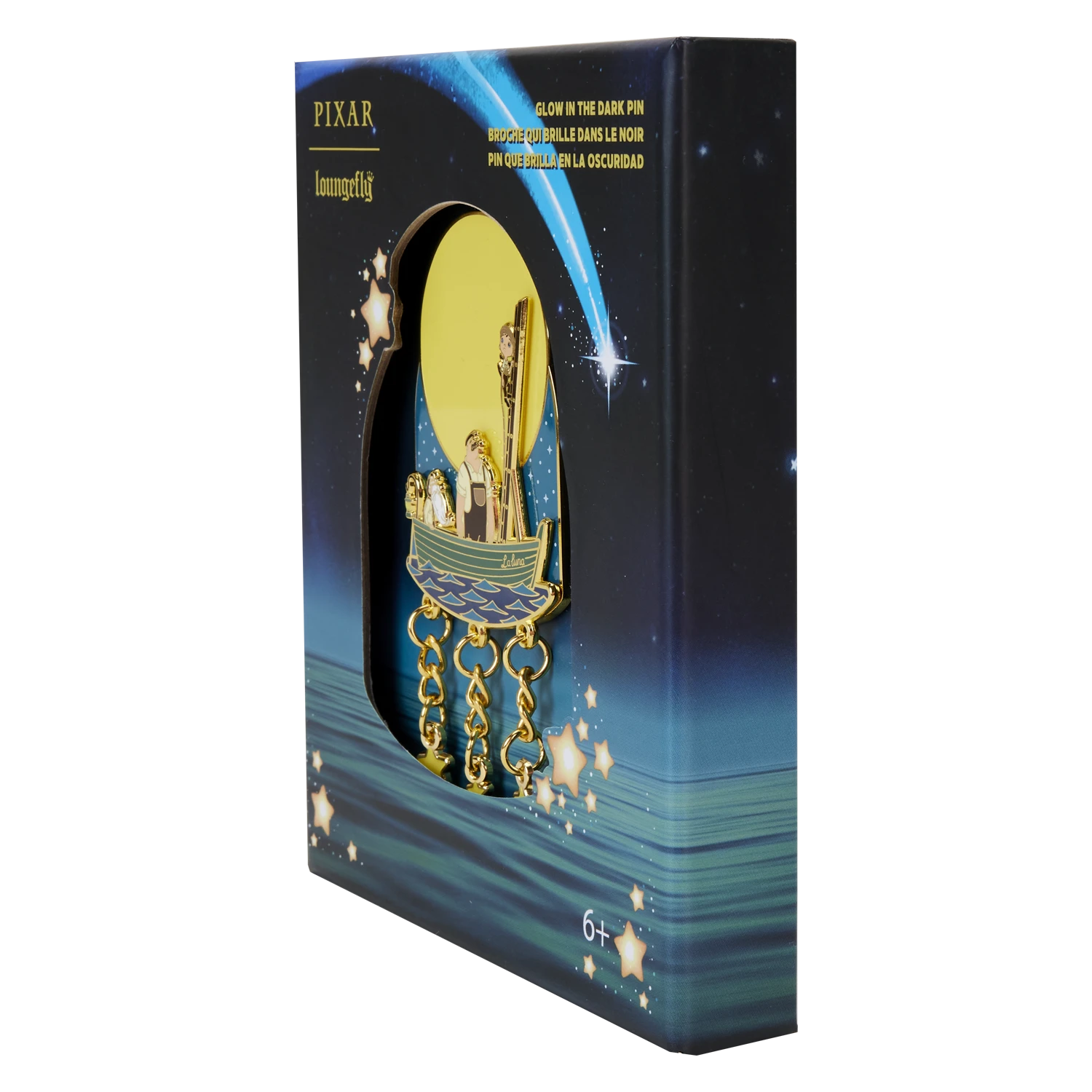 Find your place among the stars with the Loungefly La Luna Glow-in-the-Dark 3” Collector Box Pin! On this enamel pin, a large moon hangs low in a starry sky. Down below, a family of star sweepers anchor their boat as a child climbs a ladder towards the moon. Three star-shaped charms dangle beneath the waves, putting the scene in motion as they drift back and forth. Turn down the lights to see the moon and stars glow in the dark! This accessory makes an inspiring addition to any outfit or bag and is perfect for fans looking to keep one of their favorite short films close.