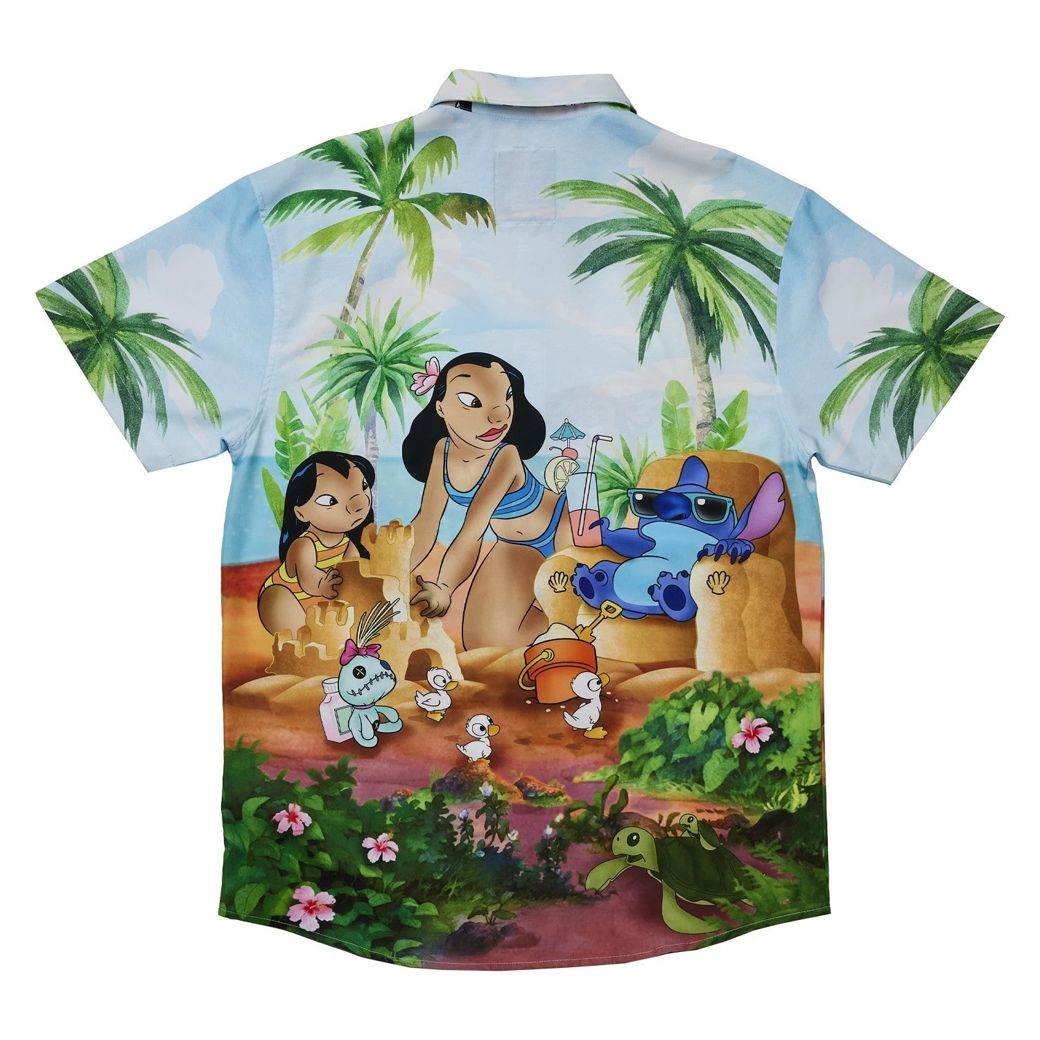 Say Ohana with our Loungefly Disney Lilo & Stitch Beach Scene Camp Shirt. A colorful scene plays out as Stitch makes himself at home in a chair of sand, where he relaxes with a tropical drink. Meanwhile, Nina helps Lilo build a sandcastle, and all around them, lush palm trees flourish overhead. Adorable ducks appear to gather around the beach bucket as well. Make a fashionable escape from the everyday routine with this comfy, summary-down, short-sleeved shirt.