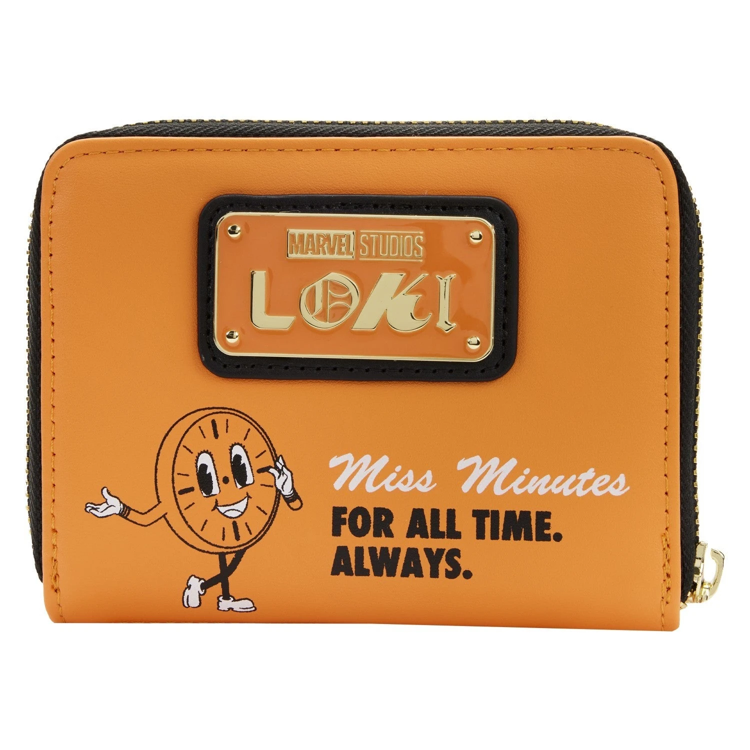 The Loungefly Loki TVA Miss Minutes Zip Around Wallet is made of vegan leather (polyurethane) with clear PVC details. Wallet zips closed and has sturdy metal hardware. Additional features include applique and printed details. Take note of the coordinating inside lining.