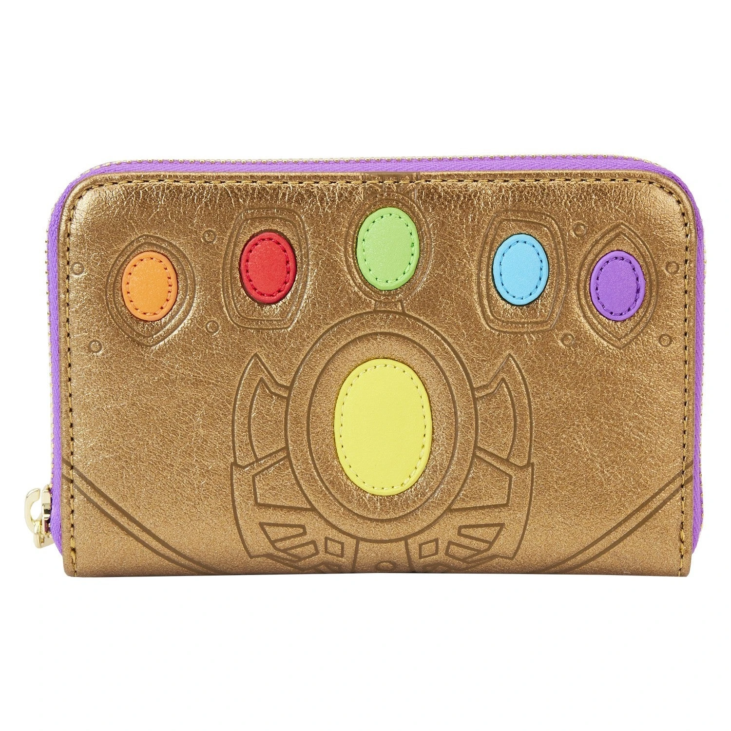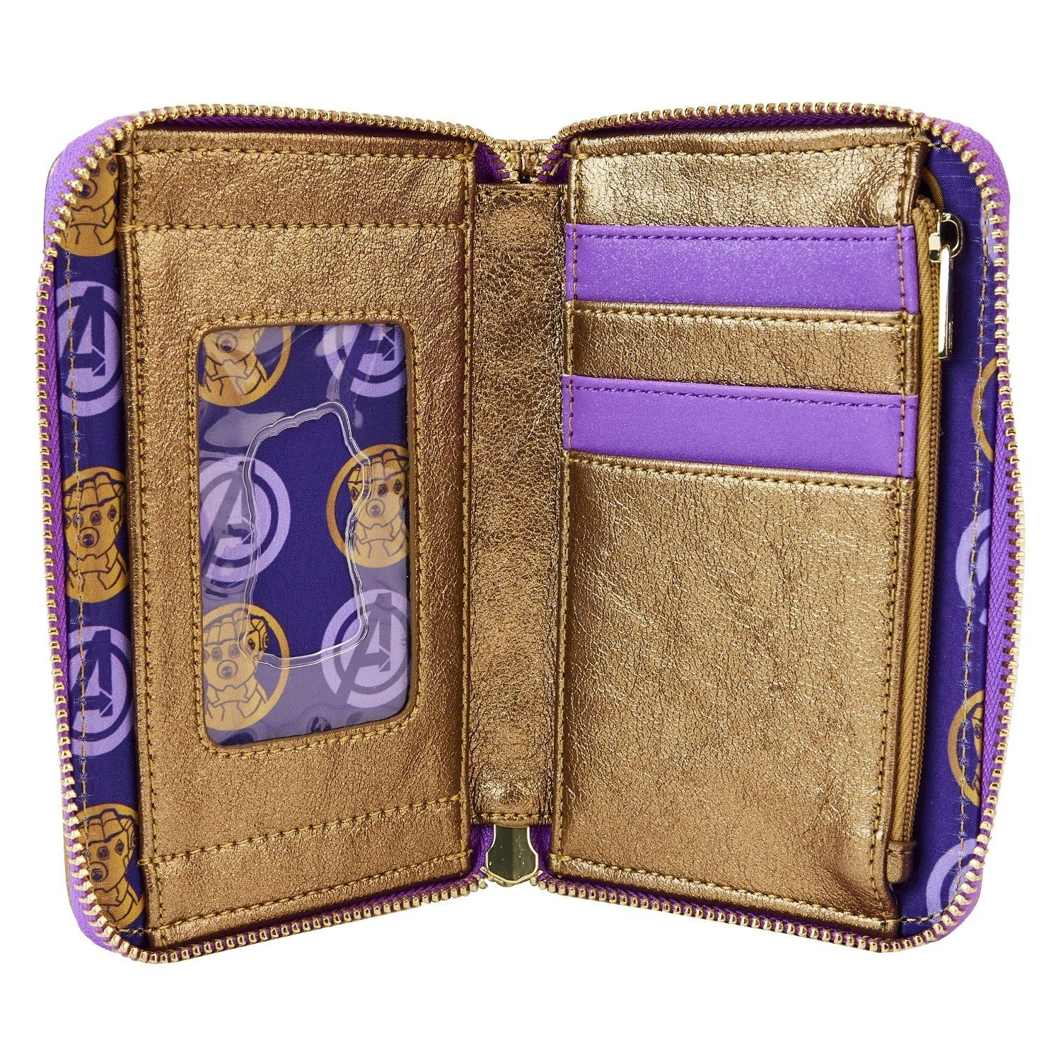 The Loungefly Marvel Metallic Thanos Gauntlet Zip Around Wallet is made of vegan leather (polyurethane). Wallet zips closed with shiny gold hardware. Additional features include applique, debossed, embossed, metallic, glitter, and printed details. Take note of the coordinating inside lining.