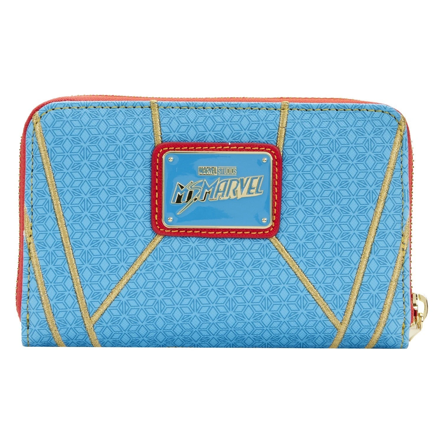 The Loungefly Marvel Ms. Marvel Cosplay Zip Around Wallet is made of vegan leather (polyurethane). Wallet zips closed, has sturdy shiny gold-colored metal hardware, and features printed, applique, and embroidered details. Take note of the coordinating pattern of the inside lining fabric.