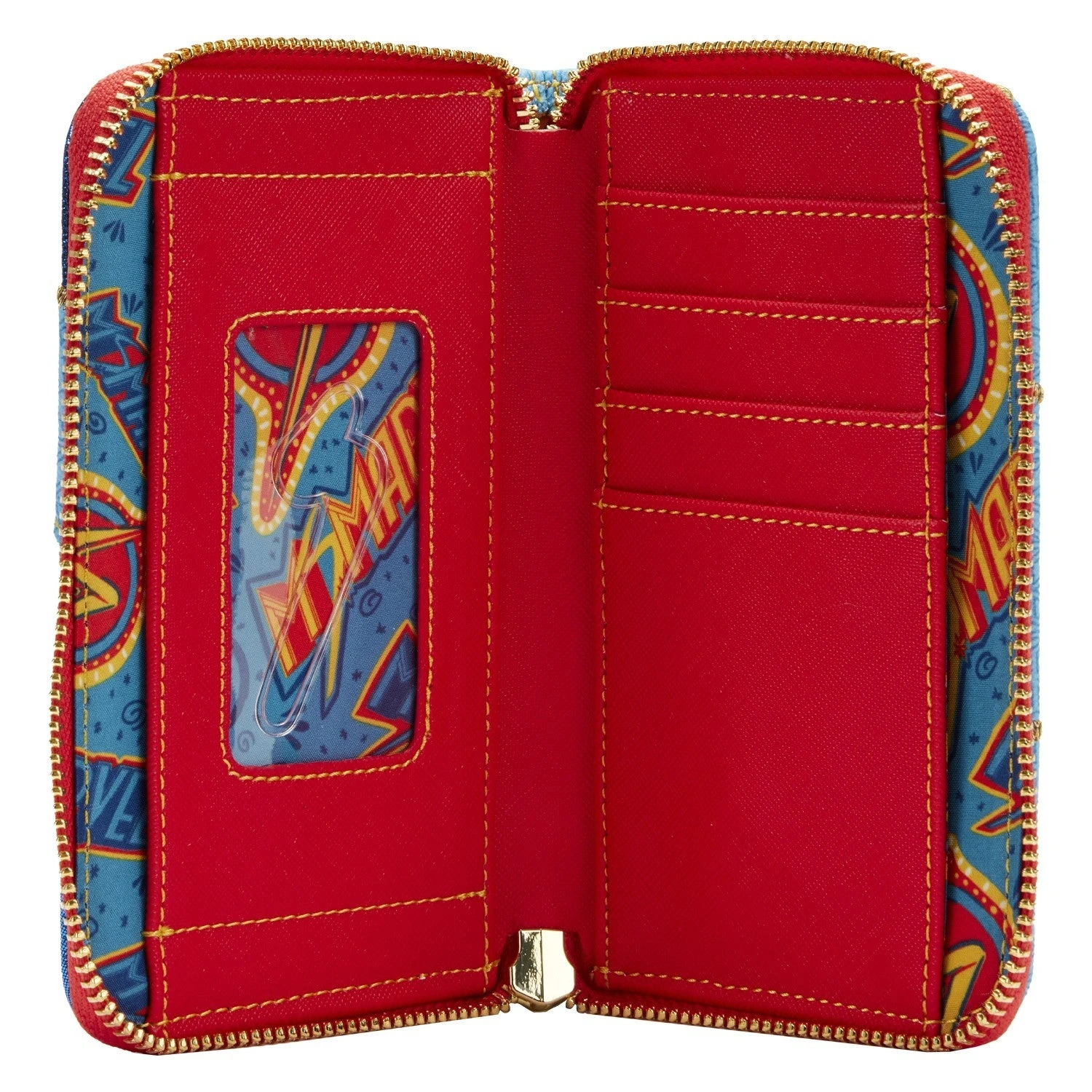Dare to dream big! Superhero heights are within reach with this Loungefly Marvel Ms. Marvel Cosplay Zip Around Wallet. Keep your valuables safe with a wallet that packs a punch. This dazzling accessory replicates Ms. Marvel’s iconic suit, complete with a golden lightning bolt with bold red stripes, which come to life in applique detail. Sheens of metallic blue contrast with subtle red accents. Gold embroidered and metallic applique flourishes save the day with a touch of sparkle. The back continues the graceful shining gold and blue details of Ms. Marvel’s uniform. Inside, you’ll find 4 slots for holding cards and 1 clear slot for holding your ID. It’s the perfect accessory for carrying your personal effects—or for stretching your everyday travels into crime-fighting adventures.