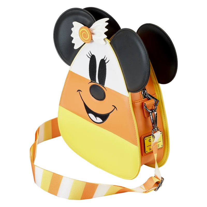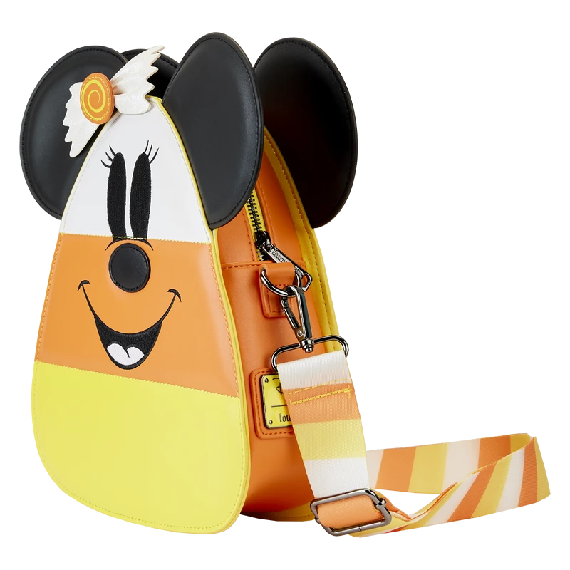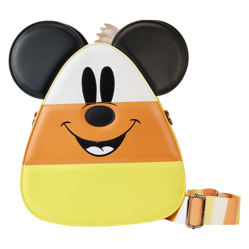 The Loungefly Disney Mickey Mouse and Minnie Mouse Candy Corn Crossbody Bag is made of vegan leather (polyurethane). Bag has adjustable straps and sturdy black-colored metal hardware. Additional features include applique, printed, embroidered, and glitter vegan leather details. Take note of the coordinating inside lining.