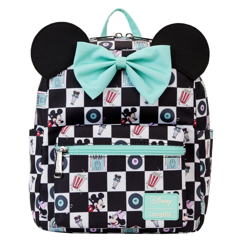 Select a song from the jukebox and prepare to dance! The Mickey Mouse and Minnie Mouse Date Night Diner All-Over-Print Nylon Mini Backpack is ready for fun. This backpack features an all-over black-and-white checkered pattern, reminiscent of a dance floor in a 1950s diner. Inside the white checkered boxes, you’ll find printed images of records, jukeboxes, Mickey Mouse and Minnie Mouse, popcorn, and ice cream sundaes. Signature Mickey Mouse ears also pop up on top. Accents of teal, including a 3D bow, add a retro pop of color, and a front zipper compartment secures smaller items for your journey. Bring your plus one, and this backpack, to kick up your heels in style.