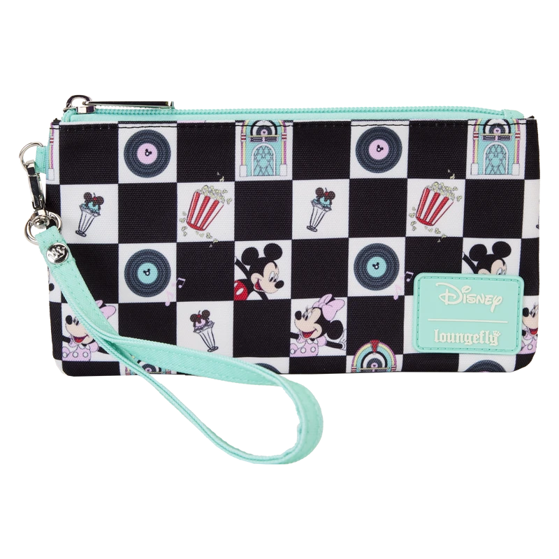 Select a song from the jukebox and prepare to dance! The Mickey Mouse and Minnie Mouse Date Night Diner All-Over-Print Nylon Wristlet is ready for fun. This accessory features an all-over black-and-white checkered pattern, reminiscent of a dance floor in a 1950s diner. Inside the white checker boxes, you’ll find printed images of records, jukeboxes, Mickey Mouse and Minnie Mouse, popcorn, and ice cream sundaes. Accents of teal add a retro pop of color. When you open the wallet, there are approximately four slots for holding cards and securing valuables. Bring your plus one, and this wallet, to kick up your heels in style.