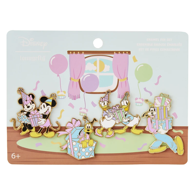 The gift table is all set, and the guests are ready to open presents! Unwrap the fun with our Loungefly Disney Mickey Mouse and Friends Birthday Celebration 4-Piece Pin Set. This collection features all your favorite Disney characters as guests at a birthday party, including Mickey and Minnie Mouse exchanging presents; Donald Duck and Daisy Duck exchanging presents; Goofy carrying a precariously stacked group of presents; and Pluto popping out of a box, with ribbons and bows. Take the celebration with you wherever you go and display your favorite fandom.