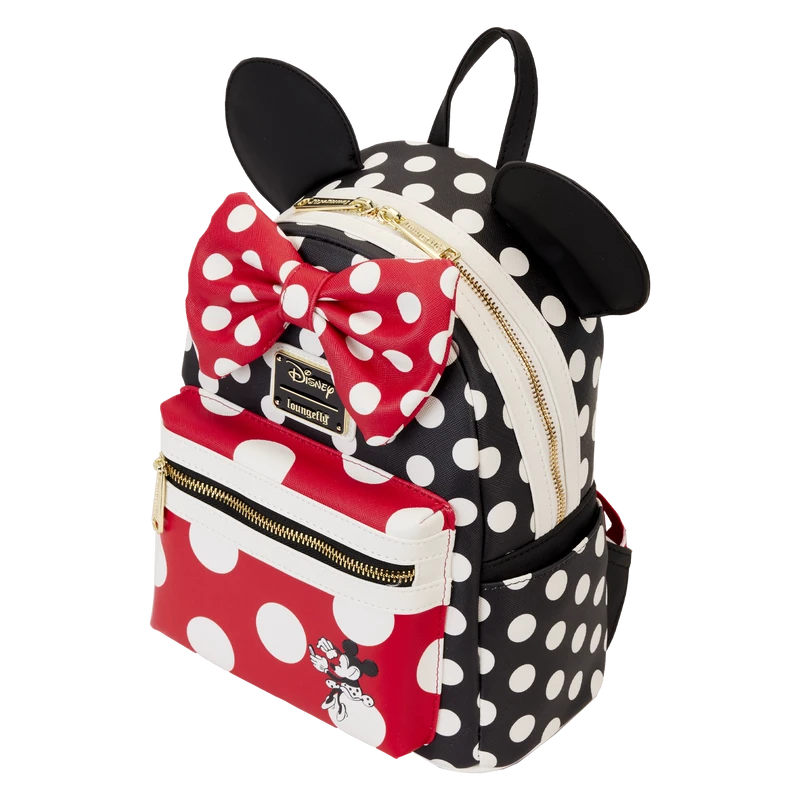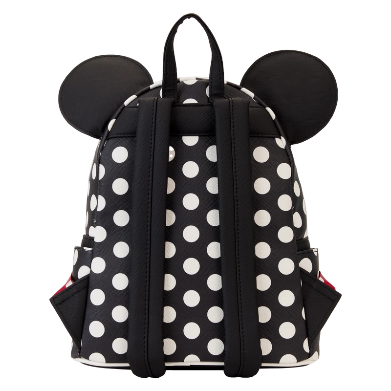 Our dotted line has a signature touch! This Minnie Mouse Rocks the Dots Classic Mini Backpack is a fresh and fabulous take on a classic style. A white dot pattern, against a black background, appears on the front, sides, and back of this accessory. The front pocket, and characteristic 3D bow at the top, offer pops of red color with white polka dots. On either side of the bow, Minnie Mouse’s ears rise up in applique detail. The front pocket also features a printed vintage image of Minnie Mouse herself. She’s seated upon a dot, freshening up her look in a compact mirror. There’s plenty of room to pack just what you need for a day’s journey, or for arriving on the dot to a fun event, in style.