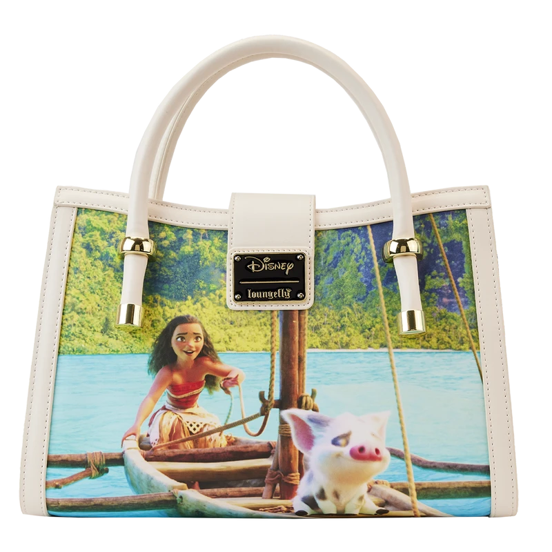 Journey beyond the reef in style with our Loungefly Disney Moana Princess Scene Series Crossbody Bag. Original, hand-drawn art brings each scene from this movie into focus. On the front, Moana and Maui stand on the outstretched hand of Te Fiti, as Maui shows his gratitude after having just received his fishhook. At the top, the Heart of Te Fiti Stone serves as the clasp, and it shimmers in blue with iridescent enamel. The side panels contain richly detailed art as well. You’ll find Te Kā on one side and Maui with a very menacing Tamatoa on the other. On the back, Moana and Pua travel the ocean in Moana’s boat. Wherever you go, make waves with this gorgeous crossbody bag.
