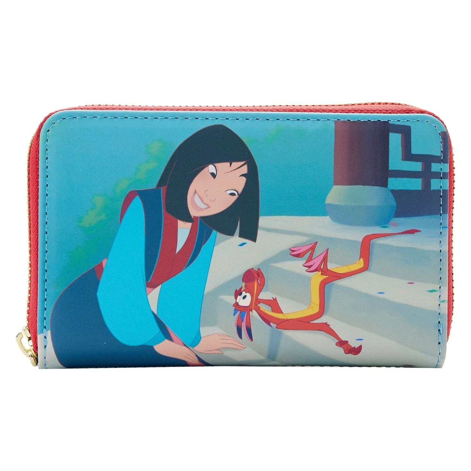 The Loungefly Disney Mulan Princess Scene Zip Around Wallet is made of vegan leather (polyurethane). Wallet zips closed, has shiny gold-colored metal hardware, and features print details. Take note of the coordinating pattern of the inside lining fabric.