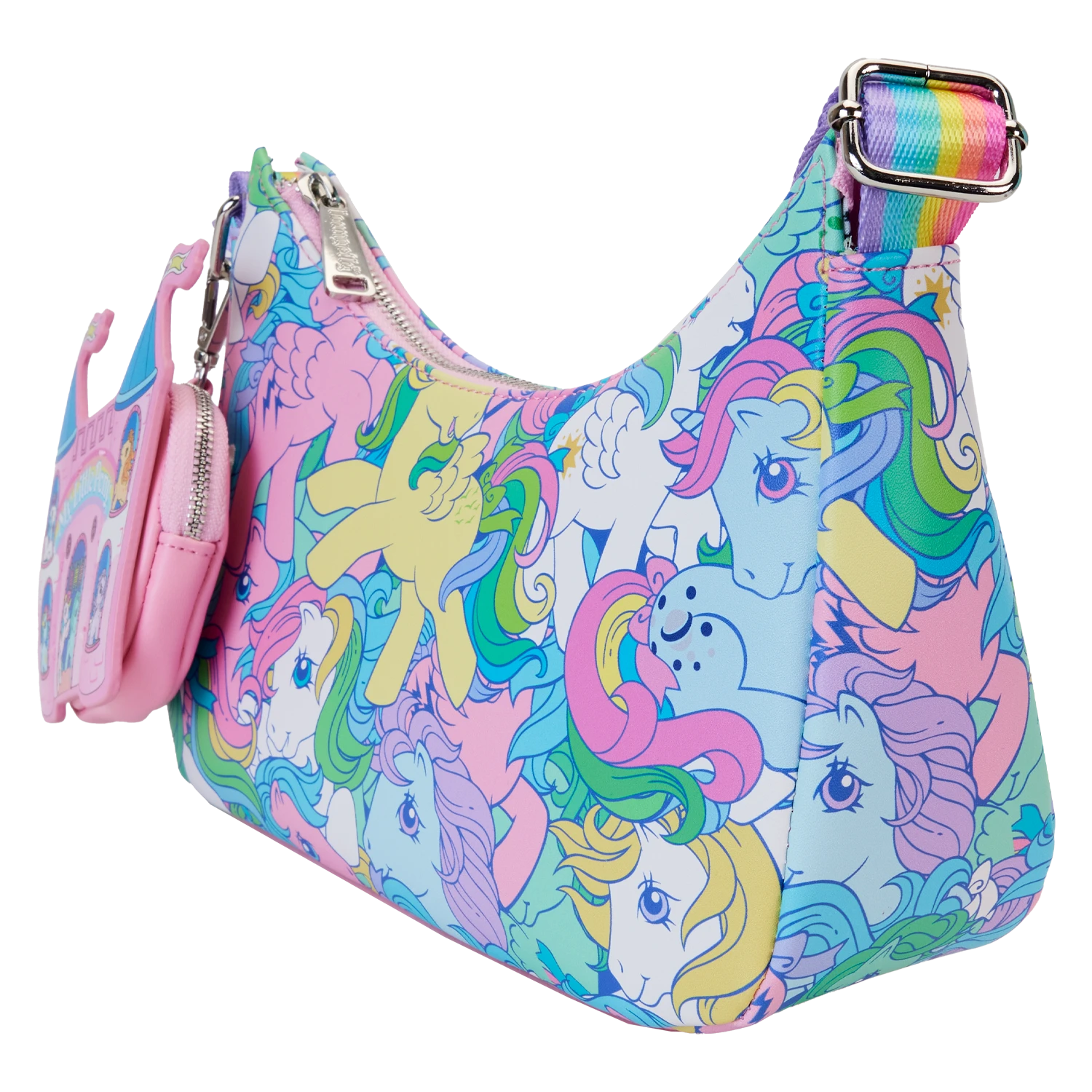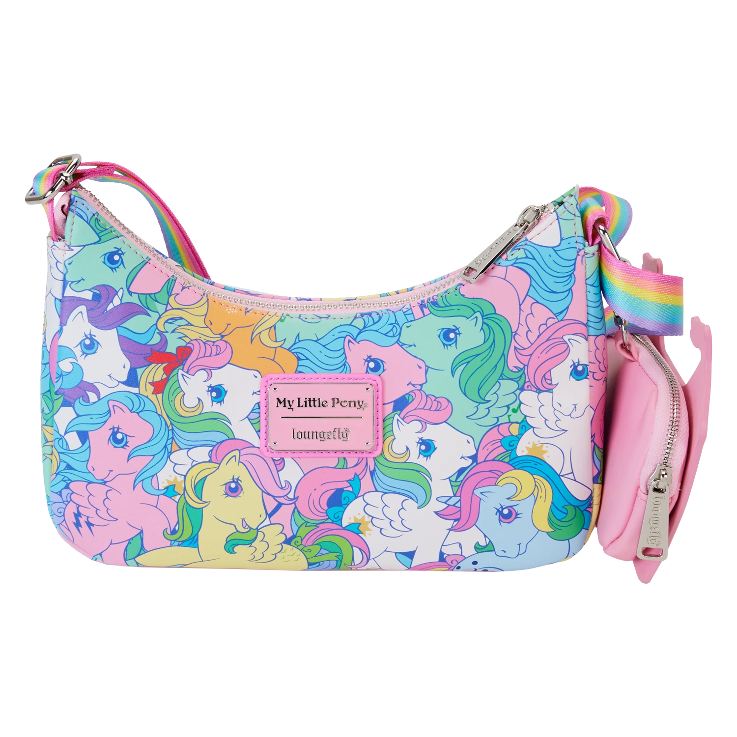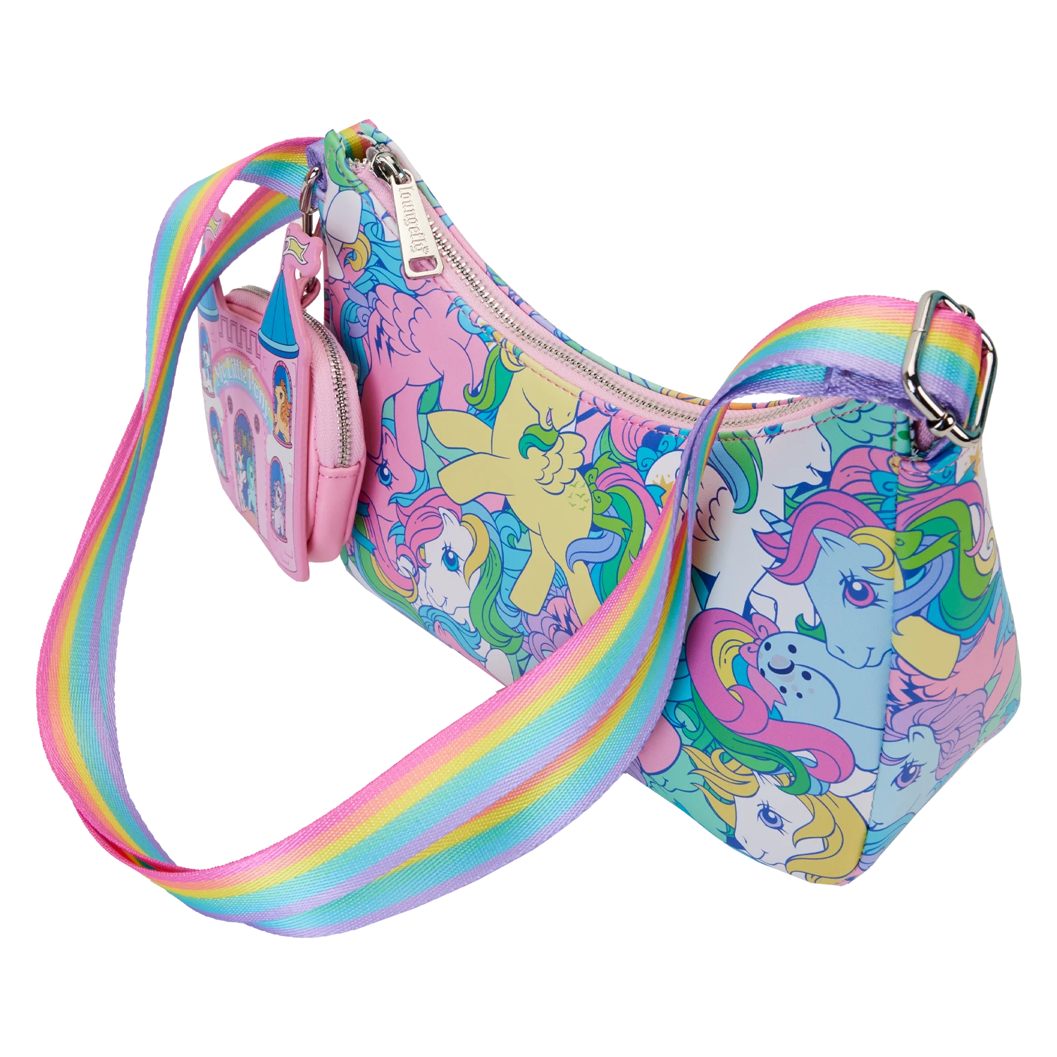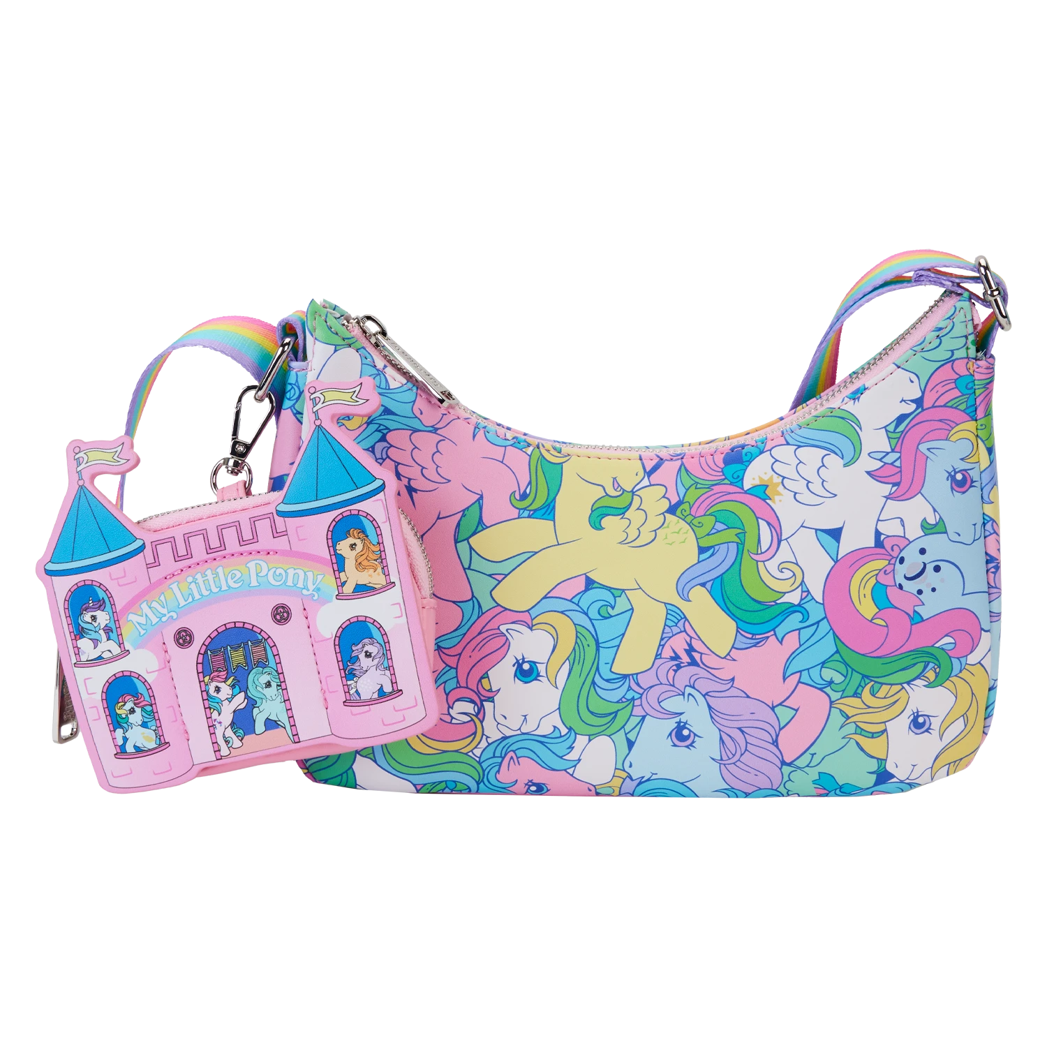 Gallop away with a rainbow of colors! Our My Little Pony All-Over-Print Baguette-Shaped Crossbody Bag is perfect for a fun-filled day of magical adventures. Colorful artwork covers this handy accessory. Fan-favorite My Little Pony characters come to life in playful prints. You might spot Starshine, Applejack, Glory, Skydancer, Firefly, Medley, and Moonstone. A detachable coin bag, in the shape of the Dream Castle, adds a whimsical, yet practical option for storing smaller items on your journeys. Pack just what you need for the day to take the reins in style.