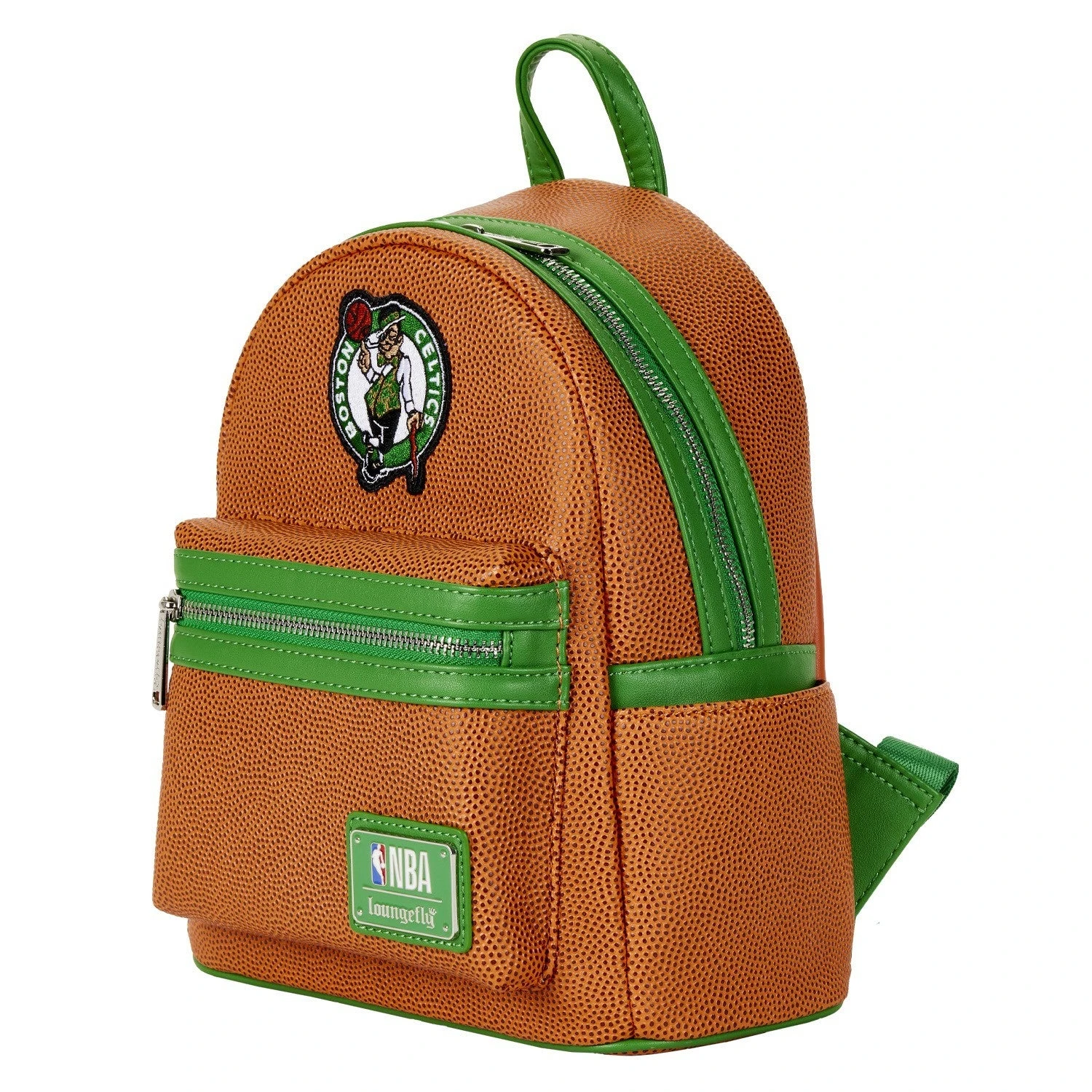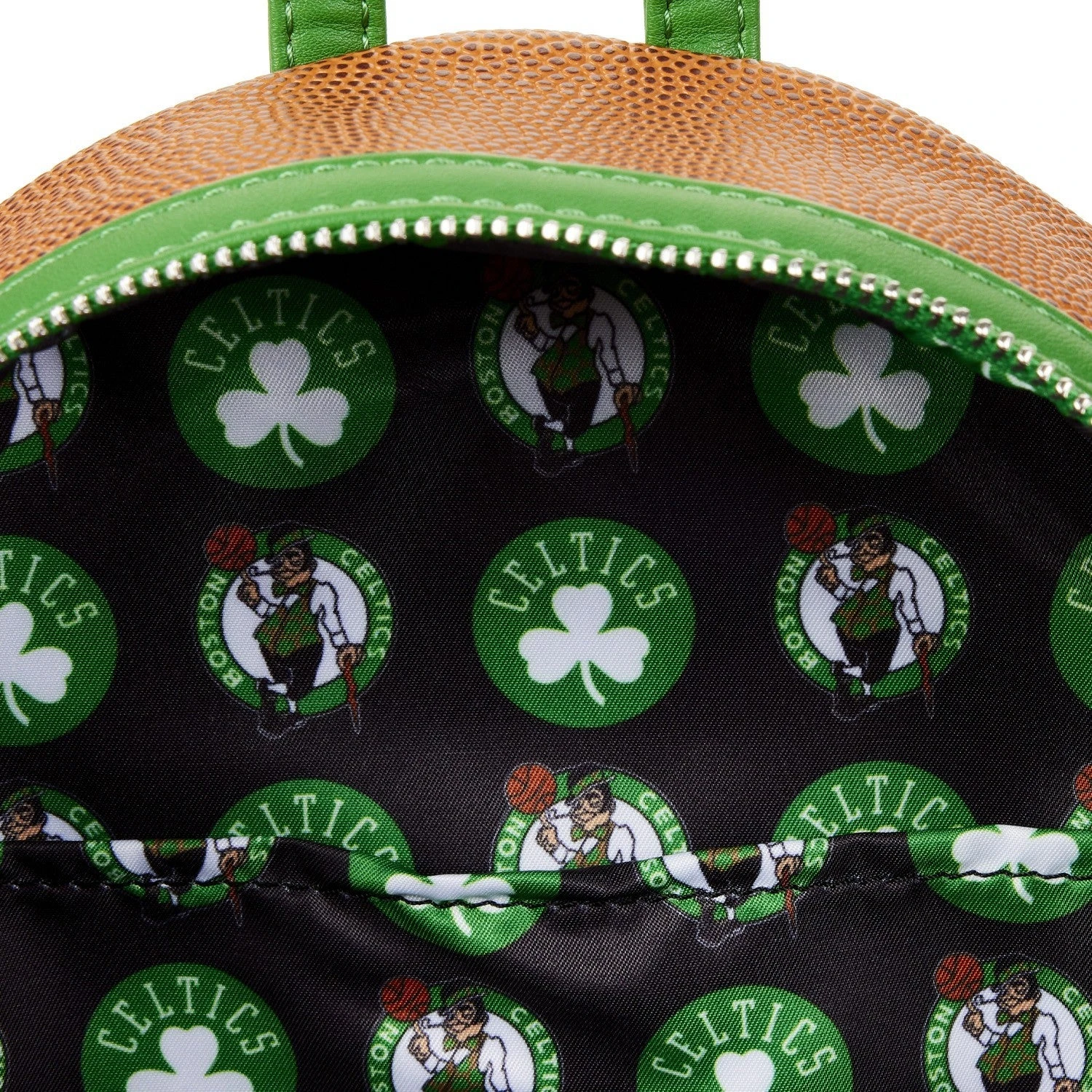 The Loungefly NBA Boston Celtics Basketball Mini Backpack is made of vegan leather (polyurethane). Bag has adjustable shoulder straps, sturdy metal hardware, and features: embroidered, debossed, and printed details. Take note of the coordinating design of the inside lining fabric.
