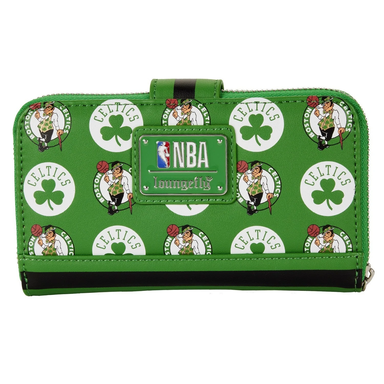 The Loungefly NBA Boston Celtics Logo Wallet is made of vegan leather (polyurethane). Wallet zips closed, has sturdy metal hardware, and features: printed details. Take note of the coordinating pattern of the inside lining fabric.