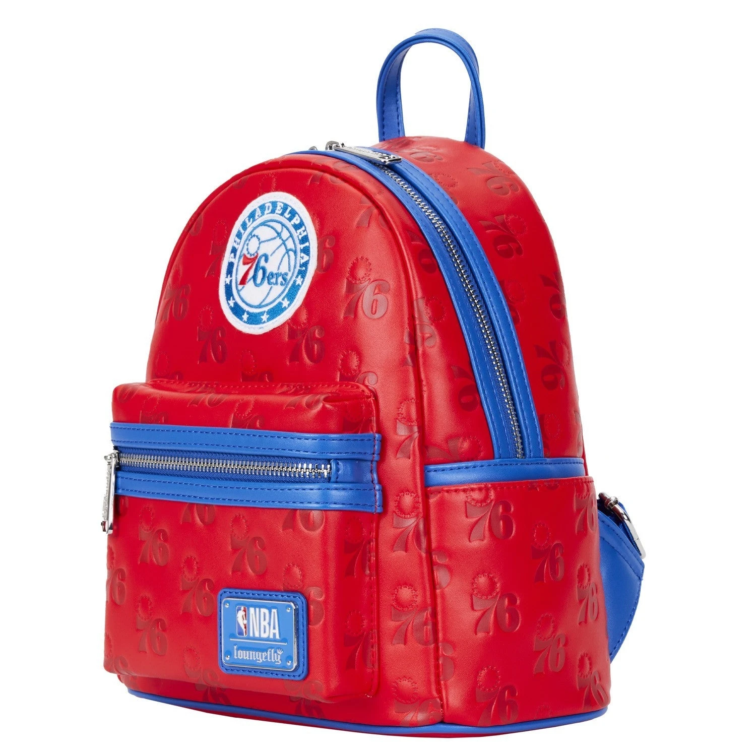 The Loungefly NBA Philly 76ers Debossed Logo Mini Backpack is made of vegan leather (polyurethane). Bag has adjustable shoulder straps, sturdy metal hardware, and features: embroidered, debossed, and printed details. Take note of the coordinating design of the inside lining fabric.