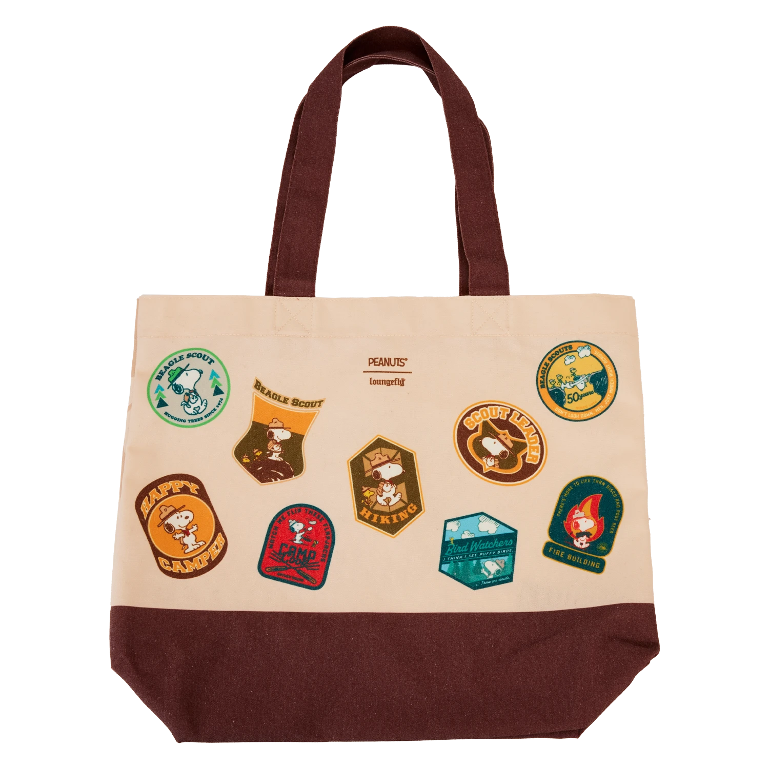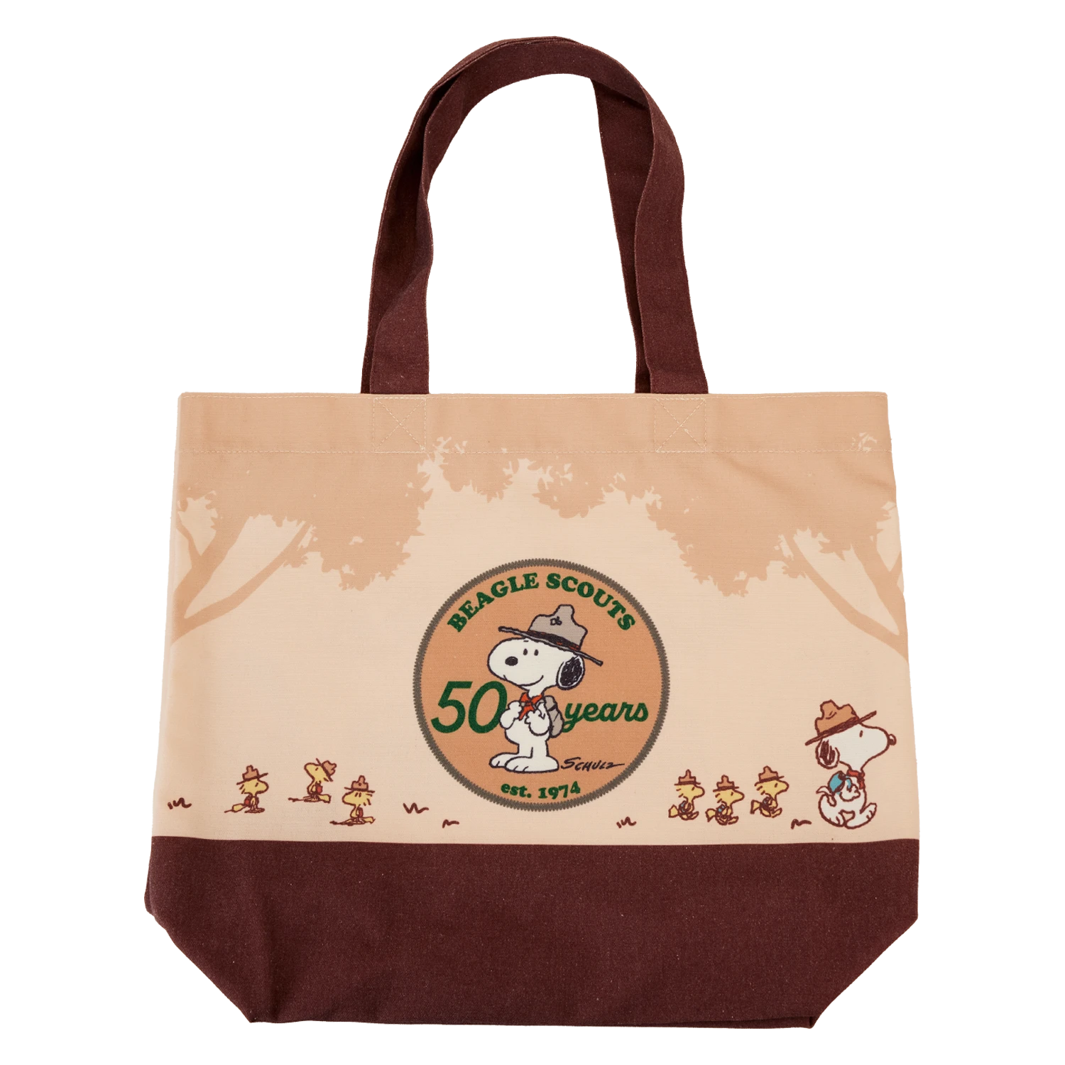 Scouting far and wide for the perfect PEANUTS gear? Look no further than this handy tote bag. This roomy accessory features Snoopy as a print on a Beagle Scouts badge that reads “Beagle Scouts 50 Years.” Shadows of trees form a canopy overhead while feathered Beagle Scouts march along in a charming, printed scene below. Snoopy, dressed as a Beagle Scouts leader, takes the lead. On the back, you’ll find more Beagle Scouts badges. Head for camp or other adventures in style.