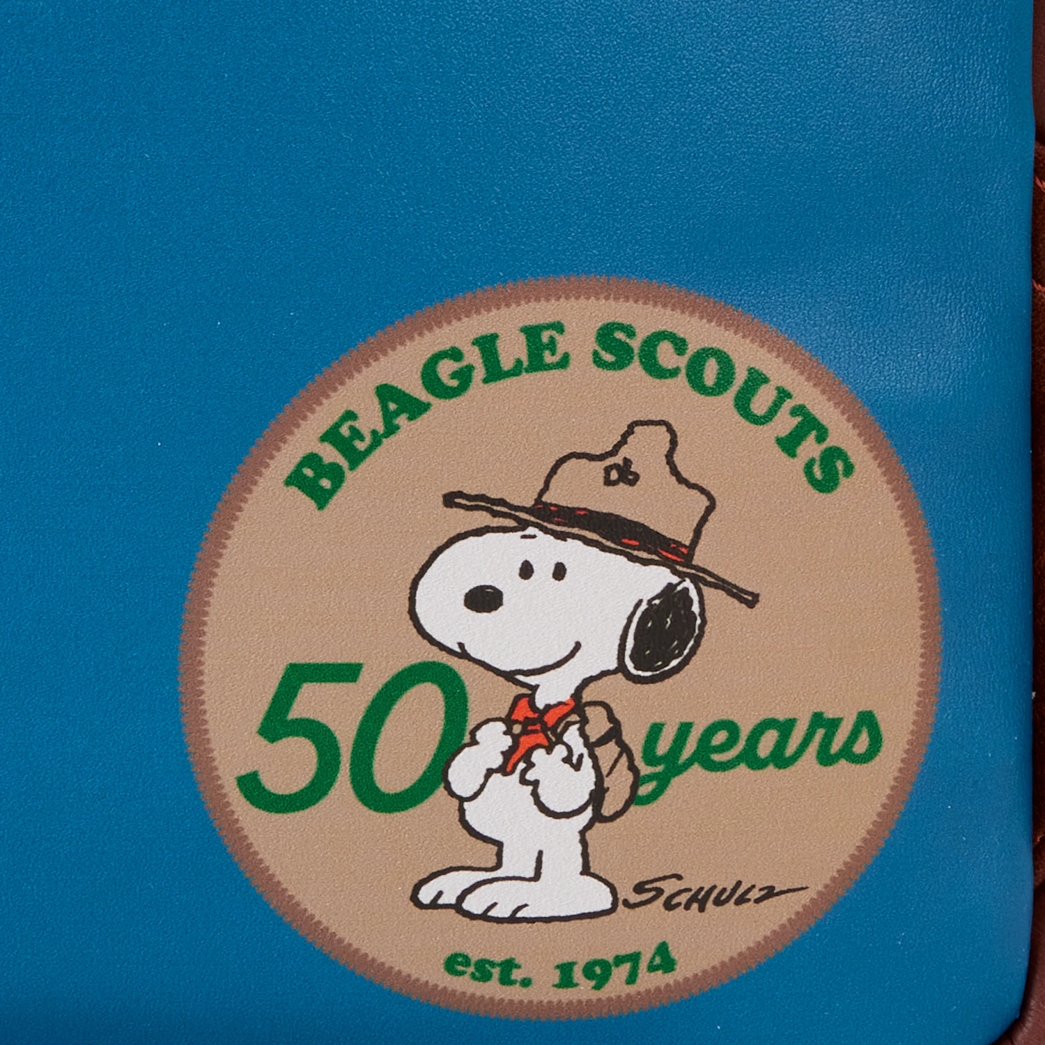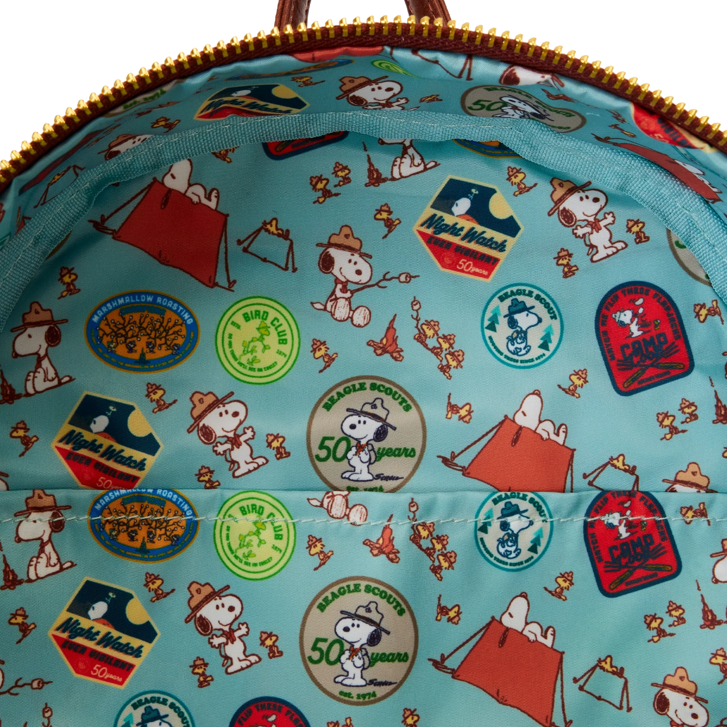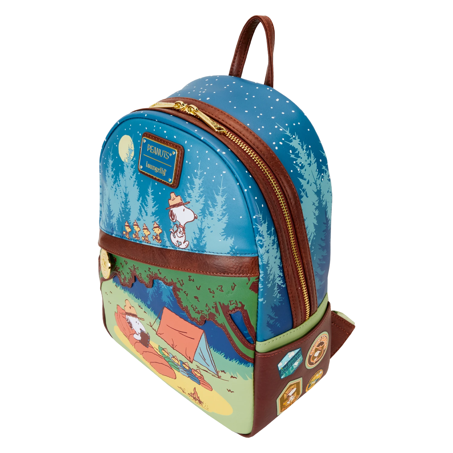 Scouting far and wide for the perfect PEANUTS gear? Look no further than this sturdy backpack, featuring original, in-house drawn art of Snoopy and his feathered Beagle Scouts campers. There’s a slim, diagonal-shaped pocket, perfect for securing smaller items on your journeys. A circular gold metal zipper charm that says, “Beagle Scouts 50 Years,” tops off the look. All the Beagle Scouts and their leader are tucked into their sleeping bags. Above them, applique trees form a canopy. In the scene overhead, Snoopy leads the Beagle Scouts up an incline, while the moon hangs in the background. In the dark, all the stars along the top of the bag glow—and the moon does, too! On the side pockets and back, you’ll discover various prints of badges as well! Head for camp or other adventures in style.