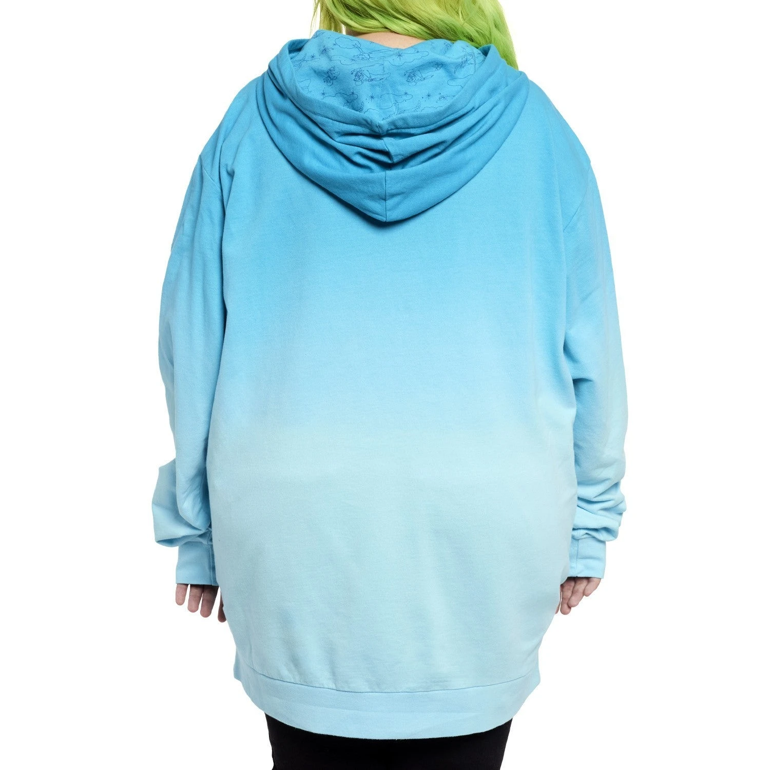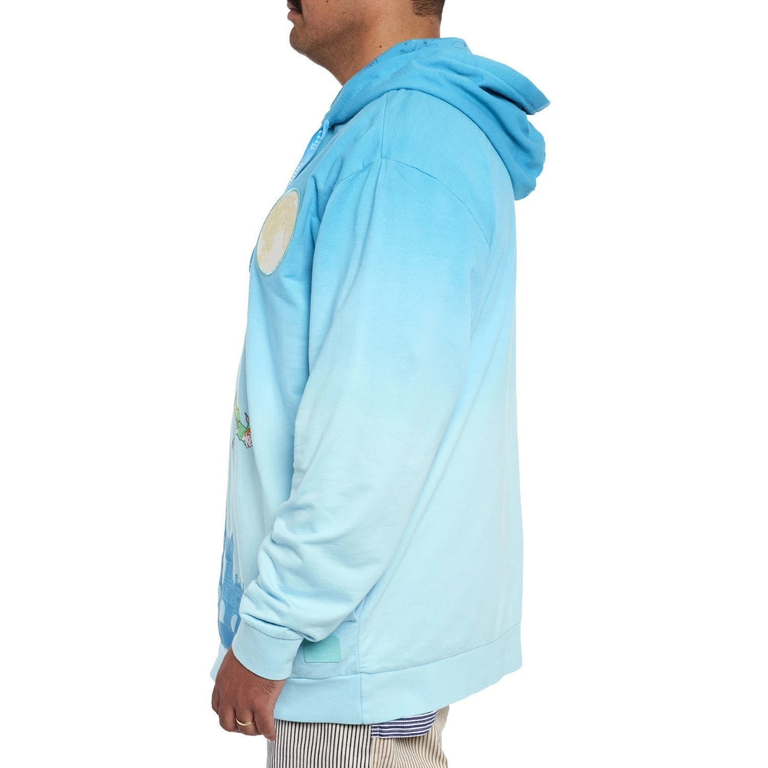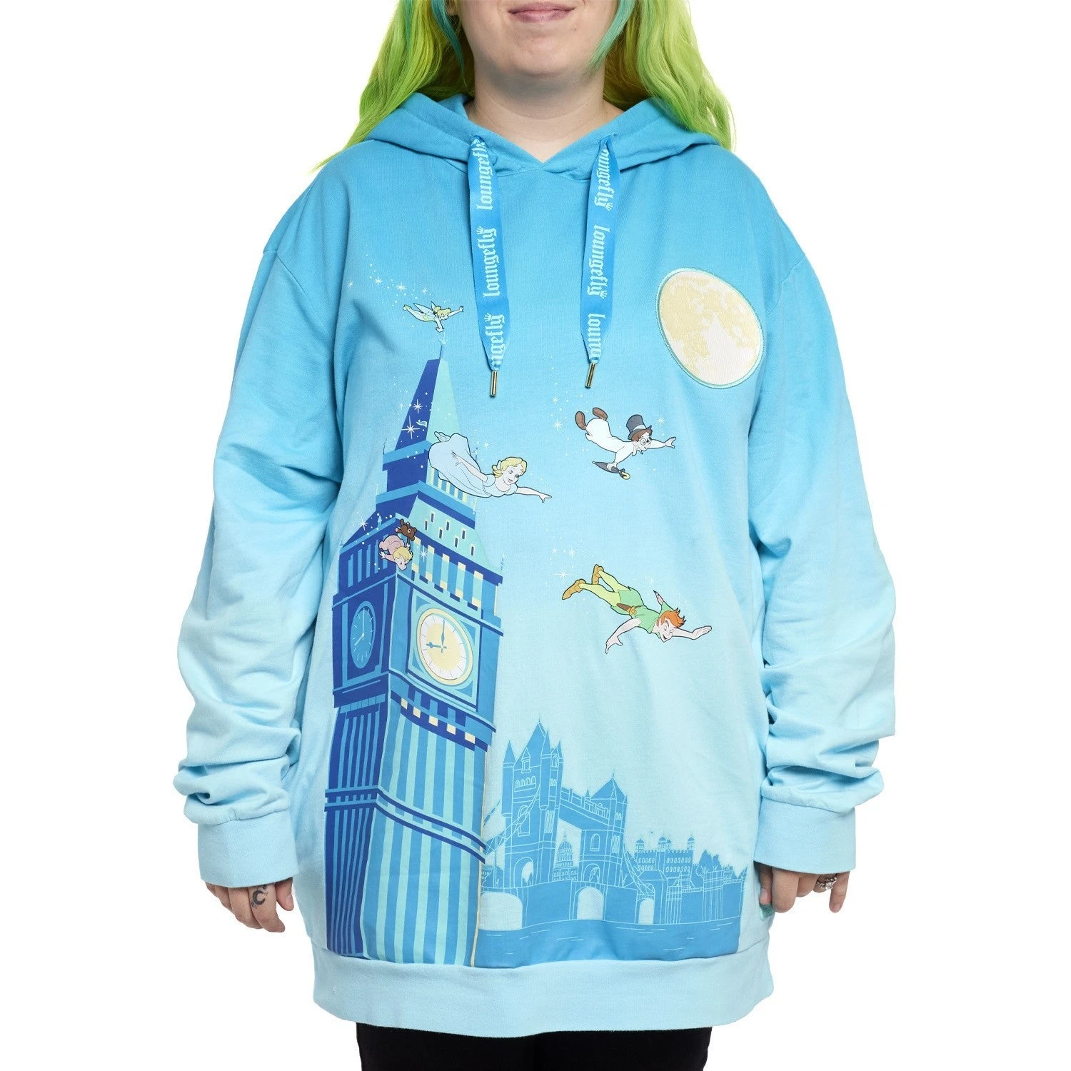 The happiest thoughts can make your adventures take flight! Set your sights on the Loungefly Peter Pan You Can Fly Unisex Hoodie, where the Darling siblings soar to Neverland with the help of their new friends. On the front, Peter Pan leads Wendy, John, and Michael across the London skyline. A full moon rises above them with embroidered details, casting the city in twilight to match the sweatshirt’s blue gradient hues. Turn down the lights to see the moon and pixie dust sparkles glow in the dark! Up above, extra-large drawcords cinch the hood lined with an all-over print of Peter, Wendy, and Tinker Bell. This hoodie adds a touch of whimsy to any outfit and will keep you cozy throughout your travels.