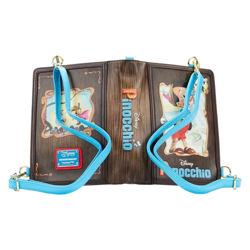 The Loungefly Classic Books Pinocchio Crossbody Bag is made of vegan leather (polyurethane). Bag has sturdy hardware and adjustable shoulder straps (removeable) that can convert into a backpack. Additional features include printed details. Take note of the coordinating inside lining.