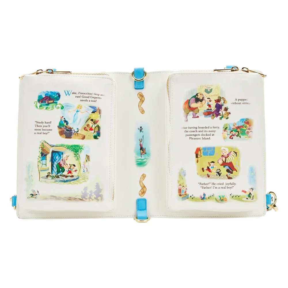 Celebrate the thrilling adventure of Disney’s Pinocchio with a lively interpretation of the animated classic! The Loungefly Classic Books Pinocchio Crossbody Bag portrays the story of this beloved puppet on a transformative journey. Resembling a book cover, the front of this bag features Pinocchio and Jiminy Cricket framed against a wood grain background. The movie’s title appears along the front and “spine” of the bag, while the back of the bag displays Pinocchio performing a play with another puppet. Open the bag up to find storybook-like artwork of Pinocchio’s adventure. Easily convertible, this bag can transform into a backpack with the book lying open against your back or can be worn closed as a crossbody purse. With secure zipper pockets disguised as book pages, this multi-function bag is the perfect accessory as you travel by land or sea.