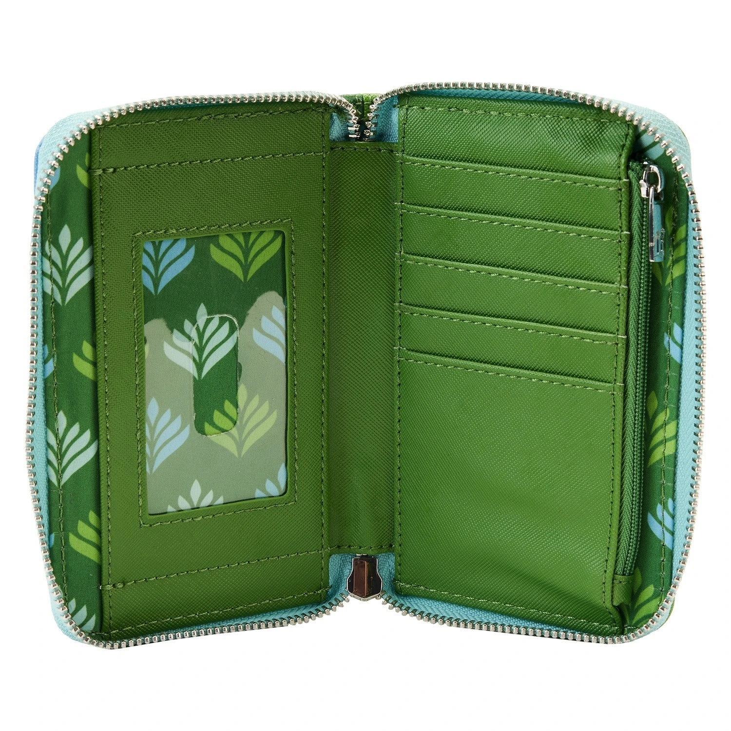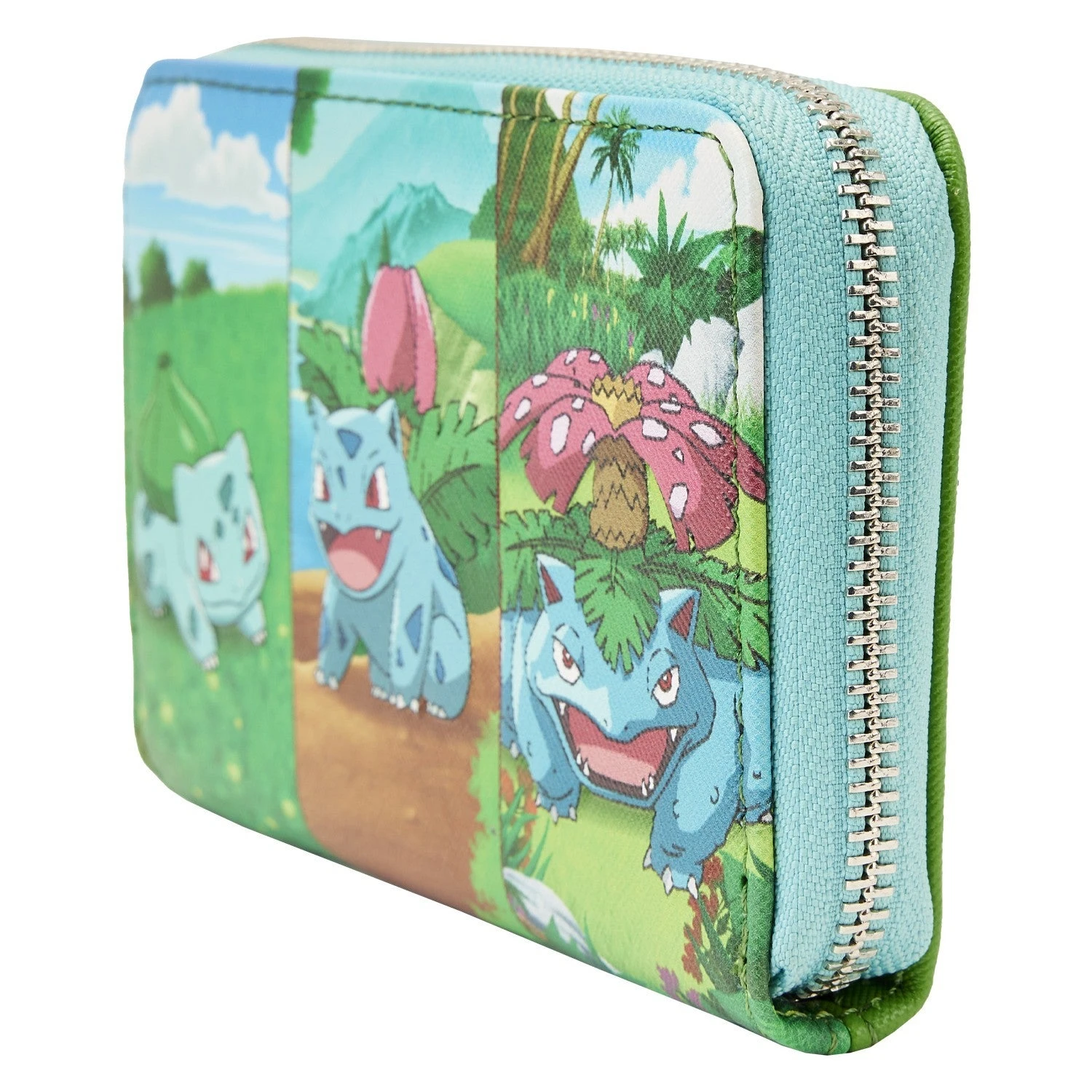 The Loungefly Pokémon Bulbasaur Evolution Zip Around Wallet is made of vegan leather (polyurethane). Wallet zips closed with sturdy metal hardware. Additional features include debossed and printed details. Take note of the coordinated inside lining.