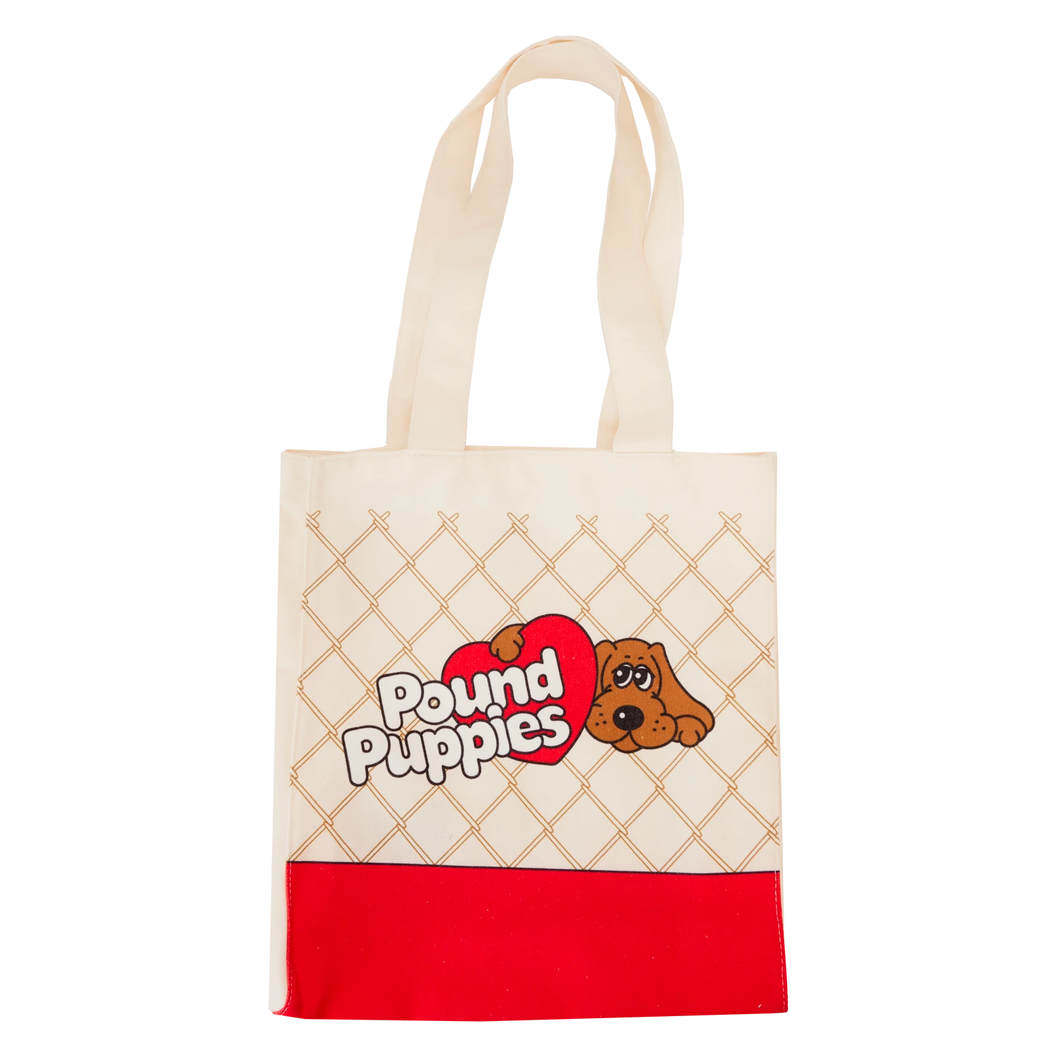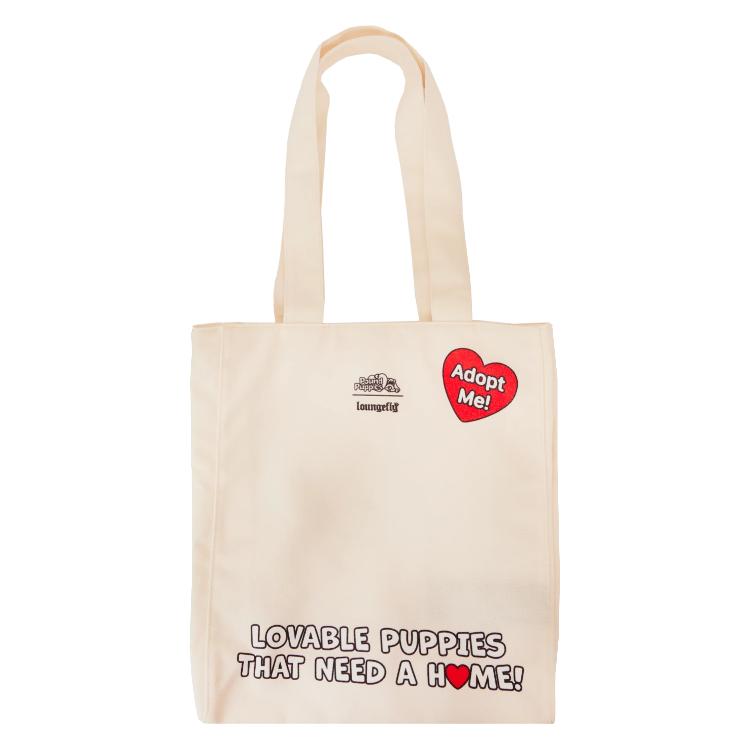 A fur-ever friend wants to tag along wherever you go! Bring home an adorable Pound Puppies tote bag. This roomy bag features a print of a sweet chocolate brown Pound Puppy on the front, draping its paw over a red heart. More prints on the front and back evoke a heart-warming, nostalgic tale of pets longing for a forever home. On the back, a printed red heart reads “Adopt Me!” and near the bottom, you’ll find the words “Lovable Puppies That Need a Home.” Show off your favorite fandom with this fetching accessory.
