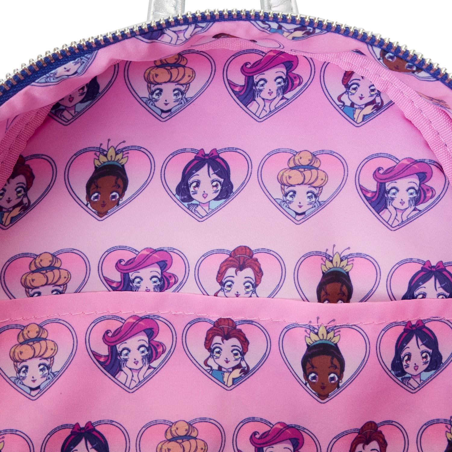 The Loungefly Princess Manga Style Mini Backpack is made of vegan leather (polyurethane). Backpack has padded adjustable shoulder straps, side pockets, and silver-colored metal hardware. Additional features include applique, glitter, printed, silver foil, iridescent, and debossed details. Take note of the coordinating inside lining.