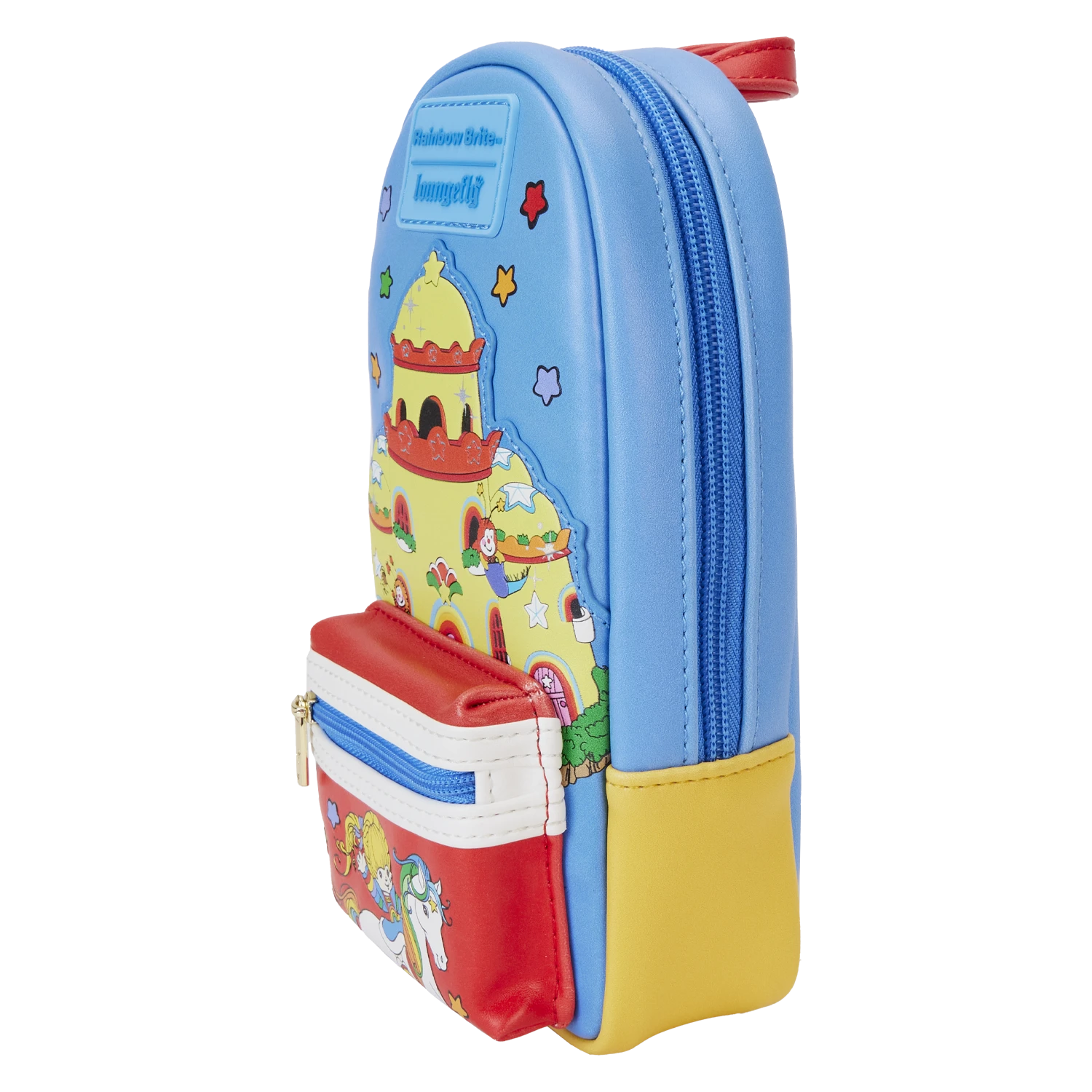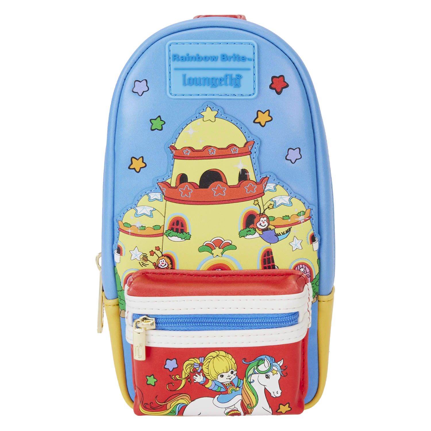 The power of the rainbow is yours! Bring color and happiness wherever you go with the Loungefly Rainbow Brite™ Castle Mini Backpack Pencil Case. On the front, Color Castle rises through the sky as Rainbow Brite rides Starlite on the zipper pocket below. On the back, Twink travels down a rainbow while Star Sprinkles appear around him. A durable lobster clip hangs at the top, making it easy to carry your important items with you. This pencil case has room for all your creative essentials and is sure to fight off any forces of darkness and gloom.