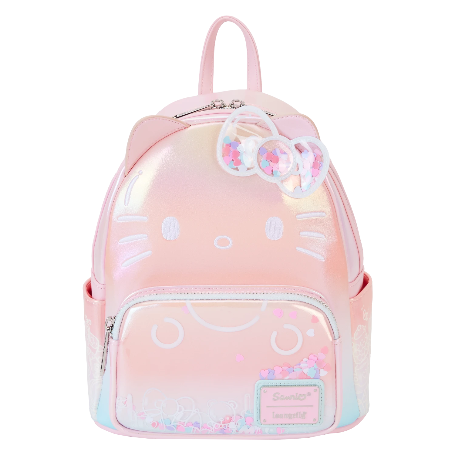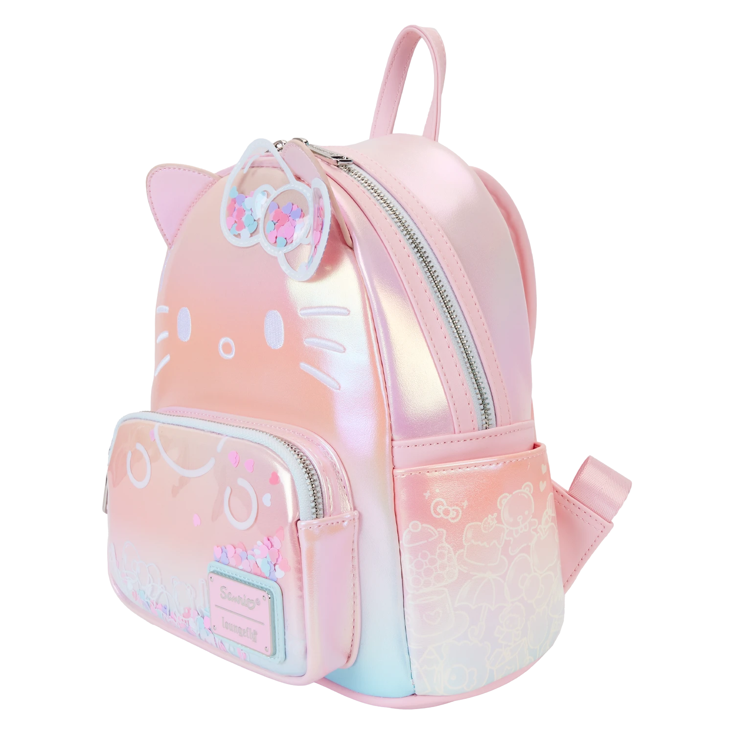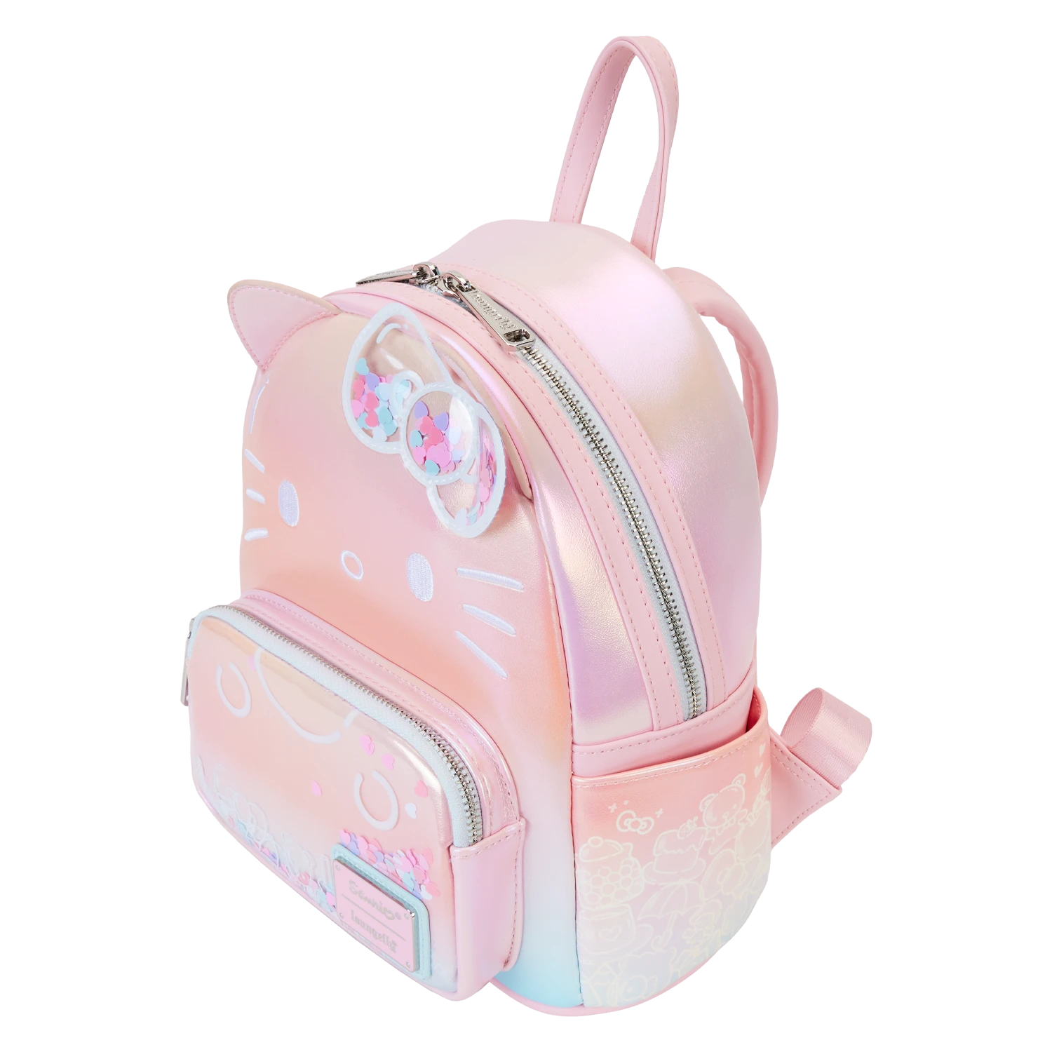 Guess who’s clearly sweet with a bow that’s neat! Break out the confetti to celebrate Hello Kitty’s 50th anniversary! This shiny pink iridescent cosplay backpack is full of surprises. And speaking of confetti…Hello Kitty’s clear bow at the top is filled with heart-shaped colorful confetti. The front pocket has clear PVC material over the top, so you can see more fun-filled confetti shapes. White print, on the pocket, reveals some of Hello Kitty’s favorite things. Her applique face is brought to life in white embroidered detail, and her ears stick up over the top. Frosted print artwork continues on the side pockets, where you’ll find images of more of Hello Kitty’s cherished belongings, including a teddy bear, apple, airplane, milk jug, and more. On the back, she makes an encore as an adorable print. Pack just what you need for the day to celebrate in style.