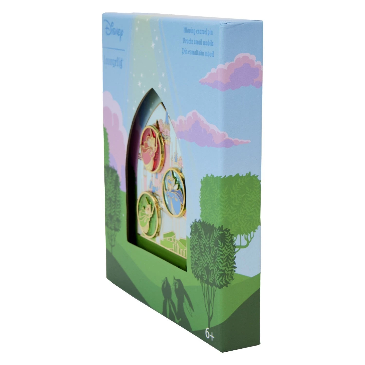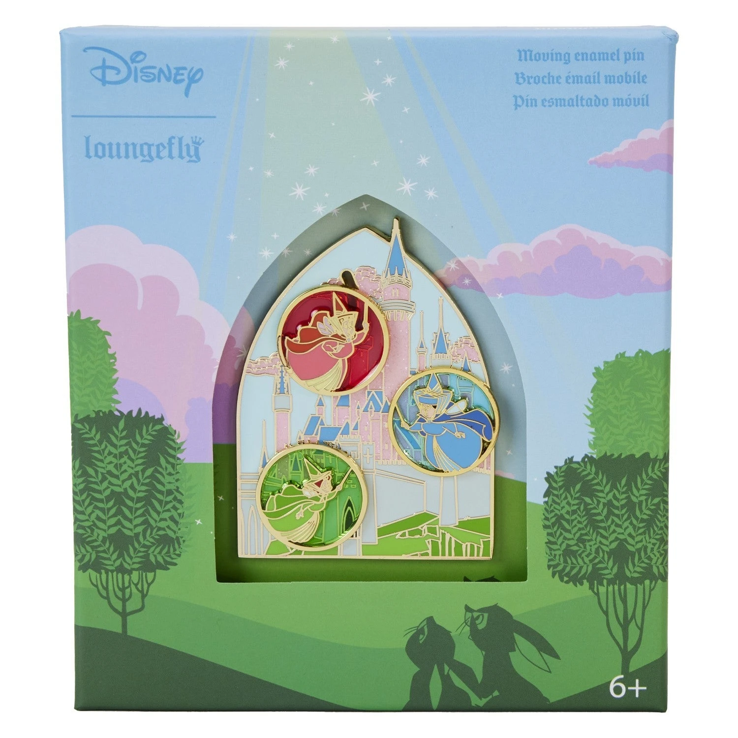 Sound the trumpets throughout the land! Our Sleeping Beauty Stained Glass Fairies 3-Inch Pin is ready for a celebration. This enamel pin features the Three Good Fairies, Flora, Fauna, and Merryweather, as they fly about the castle. Each fairy is set inside a circular “bubble” with transparent, tinted material behind them to create a “stained glass” effect. The tinted hues match each fairy’s color. A sliding mechanism allows Flora to swoop about one of the tallest castle towers. Glitter details add extra sparkle. Celebrate a special moment by adding this pin to your collection.