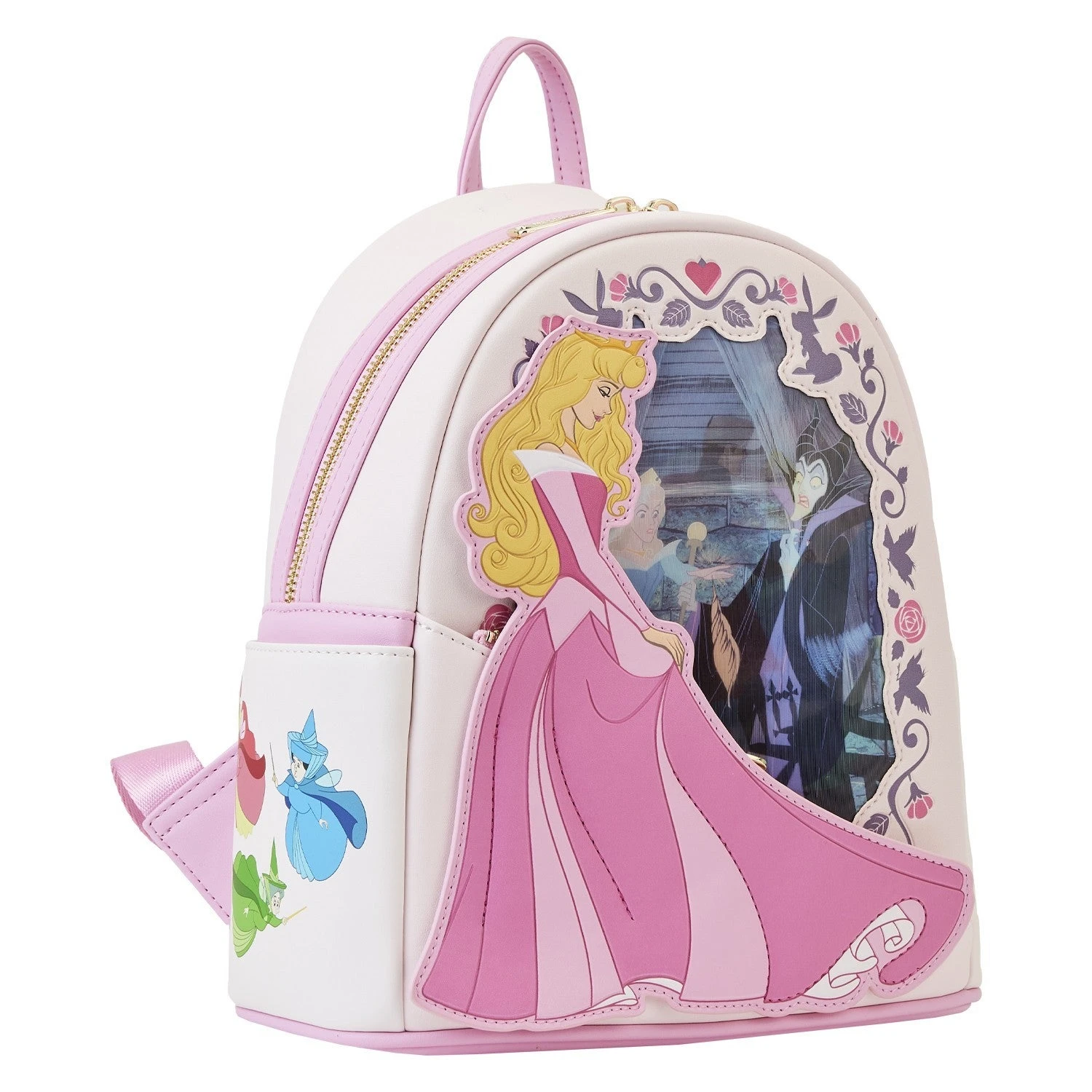 Dream up enchanting adventures with our Loungefly Disney Sleeping Beauty Princess Lenticular Mini Backpack. Disney’s Aurora graces the front, and she looks into a window, which reveals her future: she and Prince Phillip are dancing! Lenticular details, though, offer an alternate view in which she pricks her finger on the spindle of a spinning wheel, thus fulfilling Maleficent’s curse. Debossed flowers and woodland creatures frame the window, and a diagonal zipper behind Aurora’s pink flowing dress allows you to secure smaller items for all your journeys. On the side pockets, you’ll find the Good Fairies (Merryweather, Flora, and Fauna) and a woodland squirrel with flowers. Aurora and Prince Phillip dance together in an encore appearance on the back. Make a dreamy entrance wherever you go with this stylish vision of a backpack.