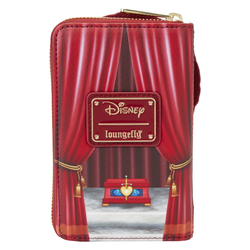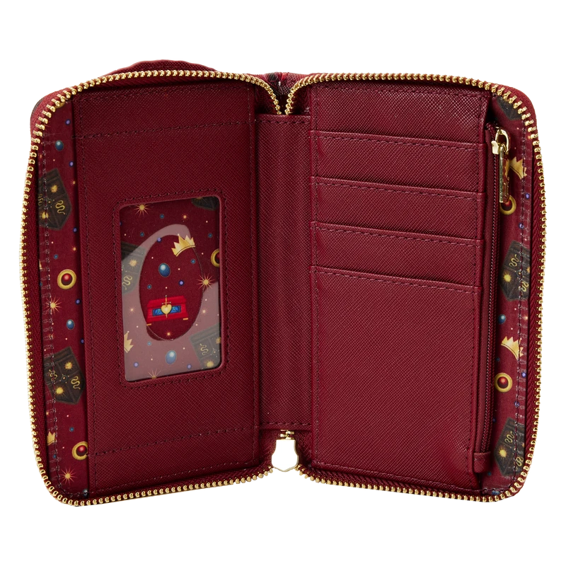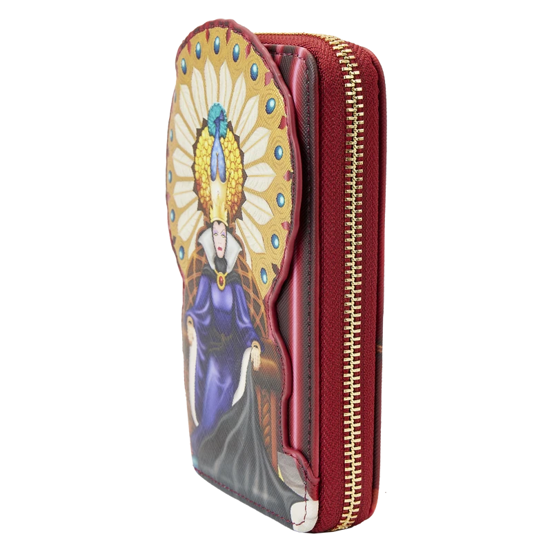 Elegantly evil and ready to rule! Bring on the reign with our Loungefly Disney Snow White Evil Queen Throne Zip-Around Wallet! The Evil Queen is looking particularly regal in the throne room. All artwork on this wallet is original and hand-drawn in-house by our artists. Applique and gold-foil details add a royal touch. A circle of peacock feathers surrounds the Evil Queen on the front of the wallet, which rises up over the top. The box, meant to keep Snow White’s heart, appears on the back, surrounded by red curtains from the throne room. Inside, you’ll find 4 slots for holding cards and 1 clear slot for displaying your ID. Keep your favorite animated moments close while adding wickedly royal fun to your everyday outings, with this exquisite accessory.