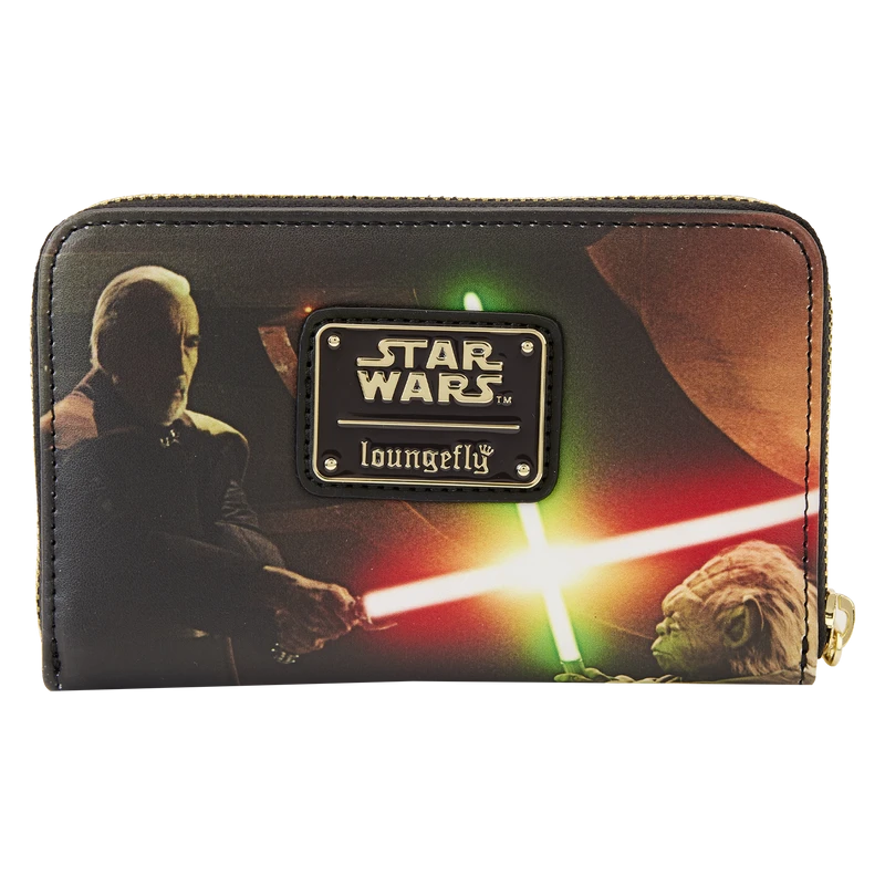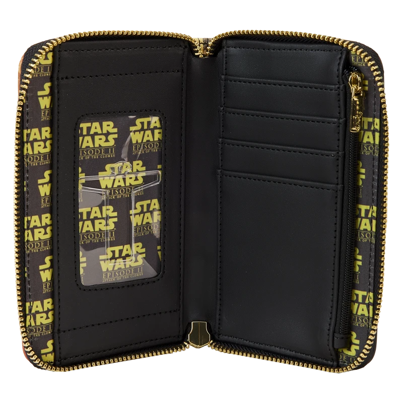 Test the limits of what it means to be a Jedi. The Loungefly Star Wars: Episode II – Attack of the Clones Scene Zip Around Wallet features cinematic moments from the legendary middle chapter of the prequel trilogy. On the front, Obi-Wan Kenobi™ and Mace Windu™ face off against an attack. On the back, Count Dooku™ battles Master Yoda™. With four slots for holding cards and a clear slot to hold ID, this galactic accessory is the perfect addition to any Star Wars™ collection.