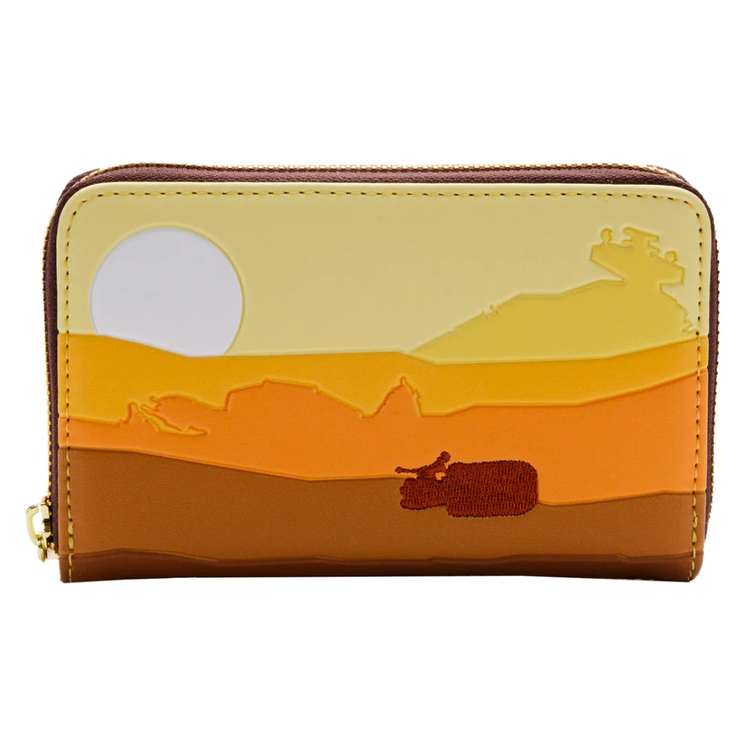 Explore the far reaches of the galaxy with the Loungefly Star Wars™ Lands Jakku Zip Around Wallet. As the sun sets on the desert planet Jakku, silhouettes of crashed ships and abandoned battle gear appear in the sand. On the front, an outline of the scavenger Rey can be found as she rides her landspeeder. The back of the wallet continues the sunset coloring of Jakku’s sand dunes. This stellar accessory has room to store all your treasures with 4 slots for holding cards and a clear slot to hold your ID.