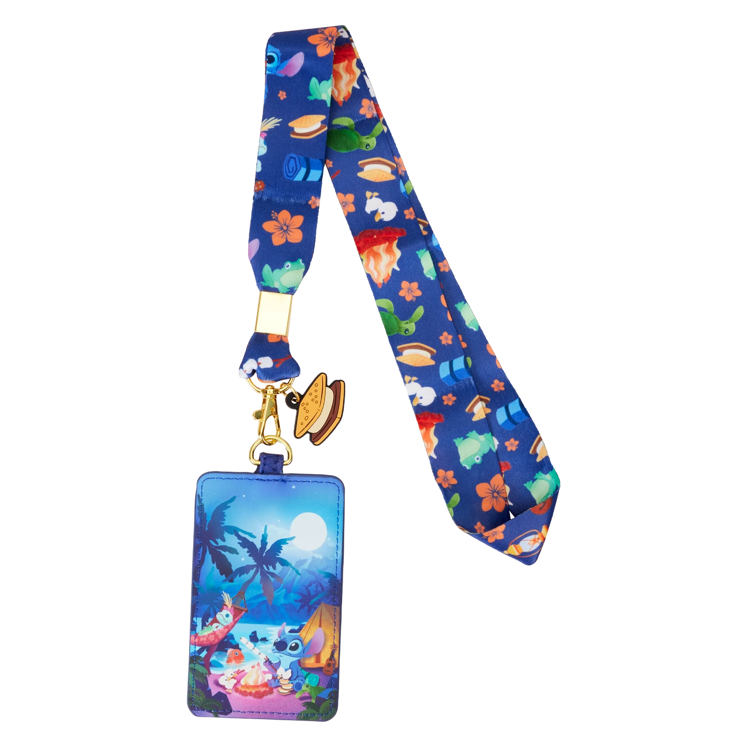 There’s nothing like sharing s’mores under the stars! Camp out on the shores of the great outdoors with the Loungefly Disney Lilo & Stitch Camping Cuties Lanyard with Card Holder. On the front of the card holder, Stitch and his pals roast marshmallows at their campsite. On the back, palm tree silhouettes appear beneath a clear slot for holding ID. Up above, the printed lanyard strap shows an all-over print of Stitch, his friends, and their camping gear. A rubber charm of a s’more completes the scene.