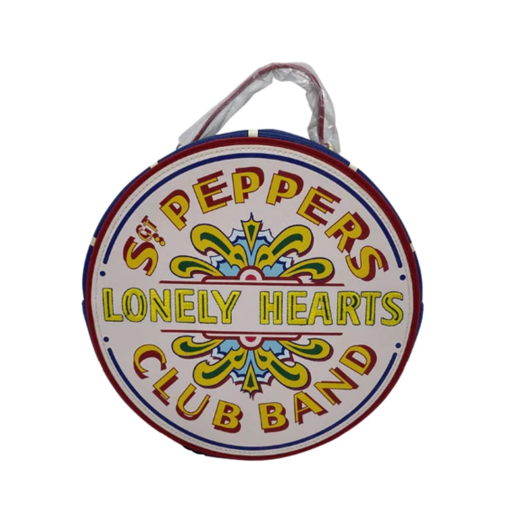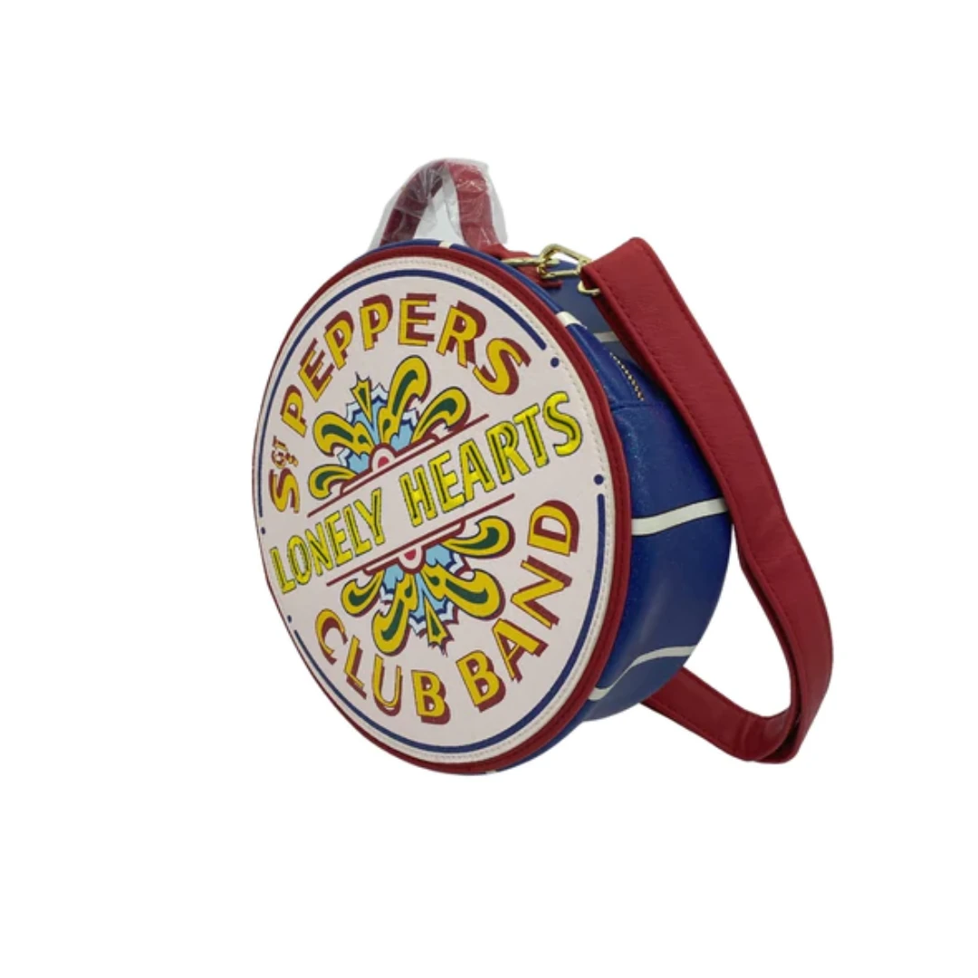 Never miss a beat with this Beatles Sgt. Pepper’s Lonely Hearts Club Band Crossbody Bag! Carry your journey’s necessities and memories in this fun and stylish bag. The entire bag is shaped like a drum with the name of The Beatles’ classic hit, “Sgt. Pepper’s Lonely Hearts Club Band” printed on top, just as it appears on the original album cover. On the back, the entire colorful crew is assembled and posing, as they did for the 1967 album.