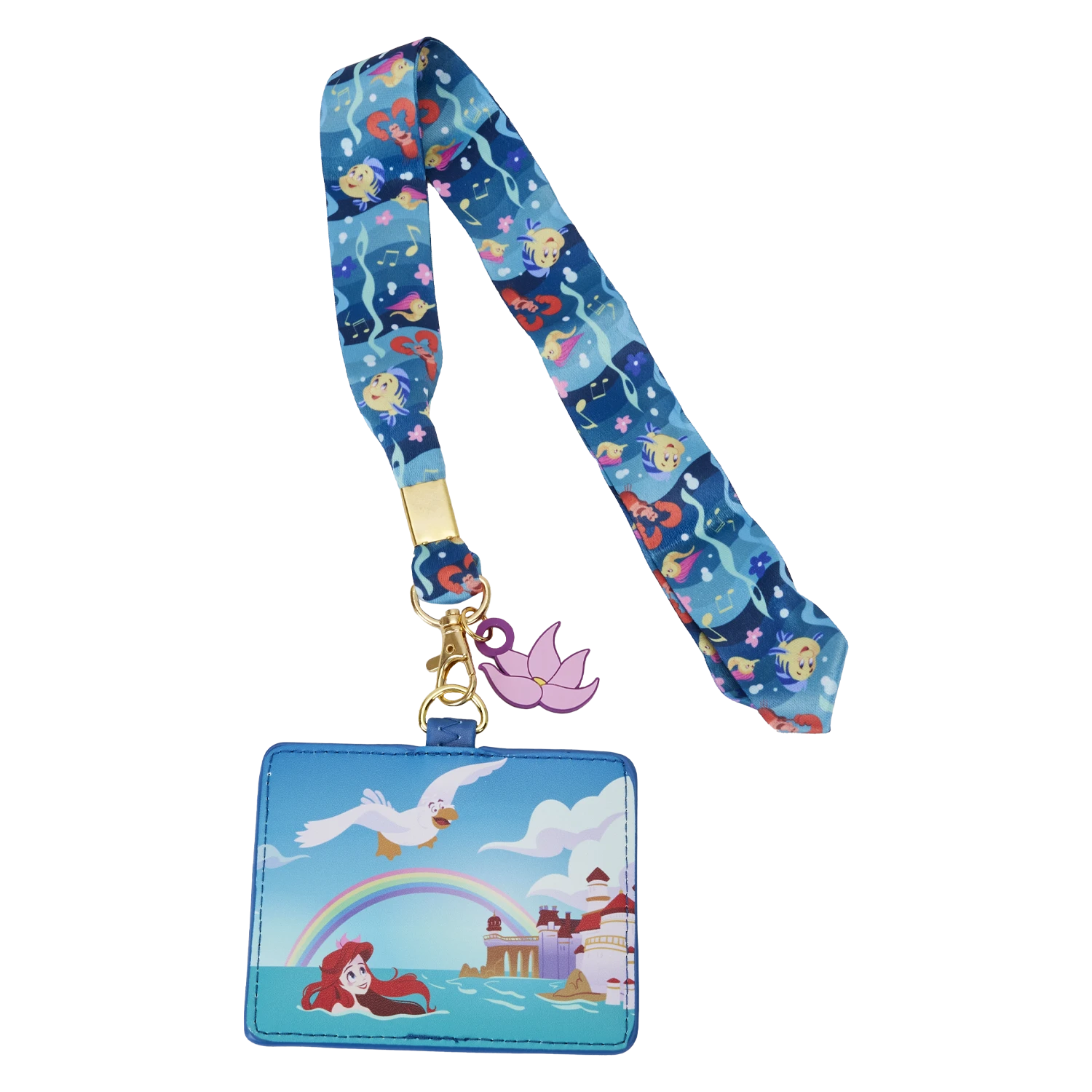 When heading for distant shores, reach land in style! Our Loungefly The Little Mermaid 35th Anniversary “Life is the Bubbles” Lanyard with Card Holder is ready for a celebration. On the card holder, Ariel swims toward shore, where a palace awaits. Scuttle accompanies her, and a rainbow appears overhead. On the reverse side, there’s a clear slot for displaying your ID or badge. The festive lanyard holds a motif featuring the “Under the Sea” moment when Sebastian takes center stage. In the motif, you might find Ariel, brightly colored aquatic plants, Flounder, Sebastian, seahorses, flowers, musical notes, and bubbles. A rubber charm of Ariel’s flower tops off the look. Swim away with something fun to celebrate The Little Mermaid’s 35th anniversary.