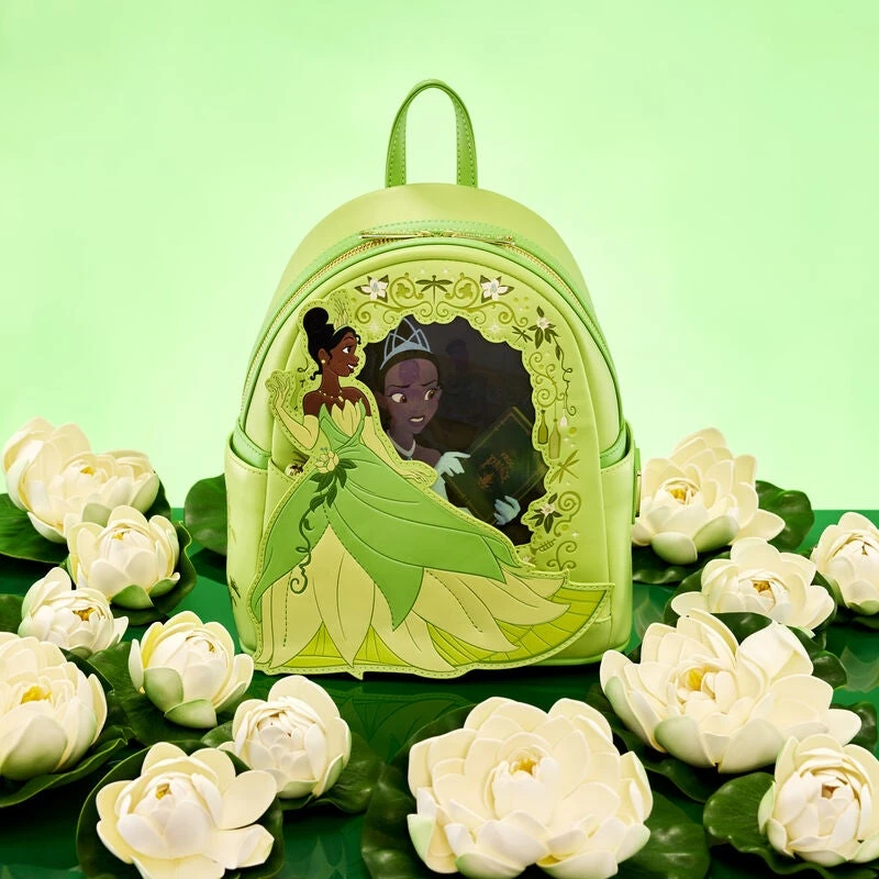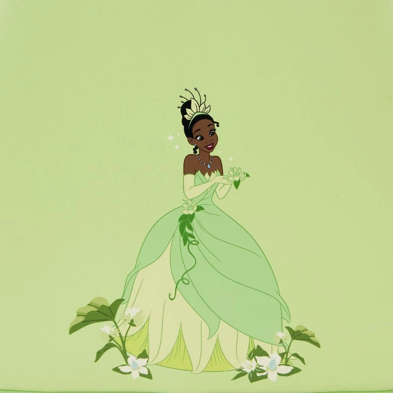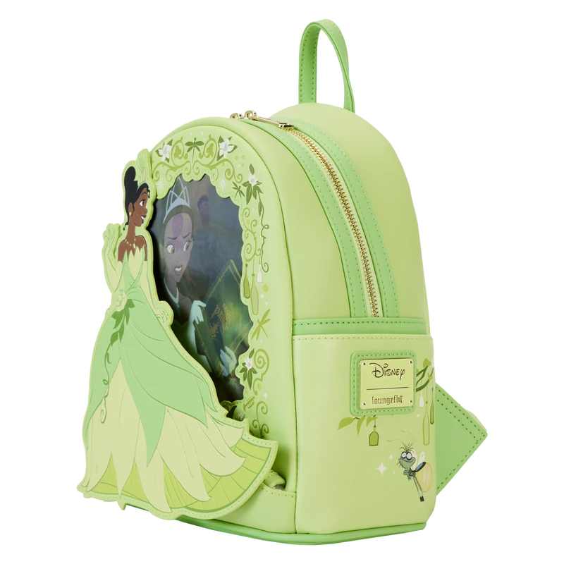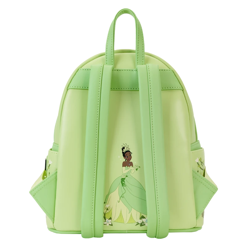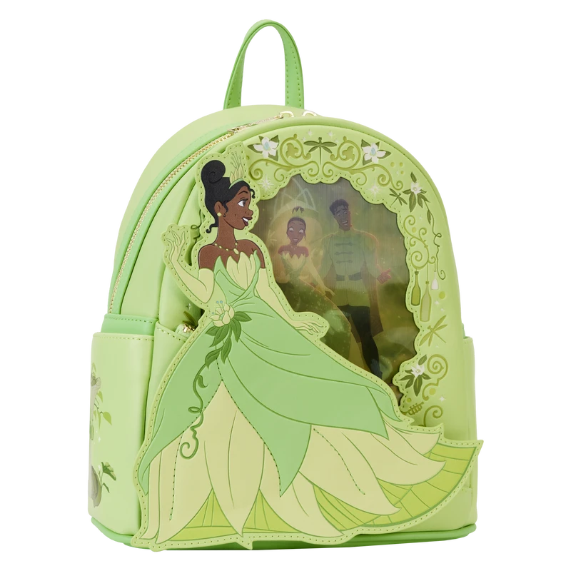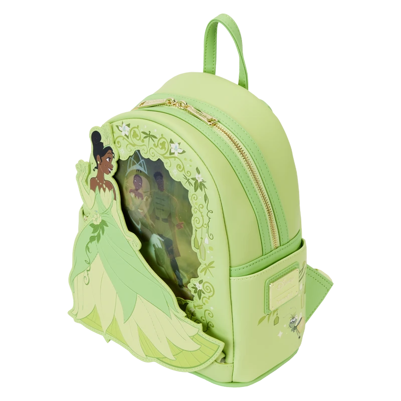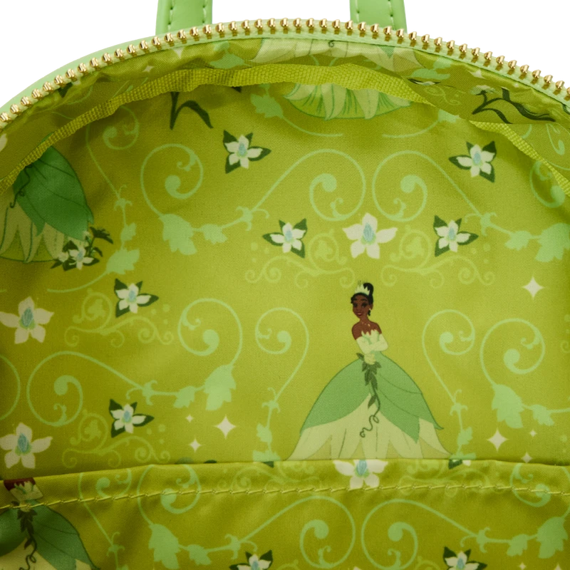The Princess and the Frog Tiana Lenticular Mini Backpack is made of vegan leather (polyurethane). Bag has adjustable shoulder straps and shiny gold hardware. Additional features include applique, debossed, lenticular, and printed details. Take note of the coordinating inside lining.
