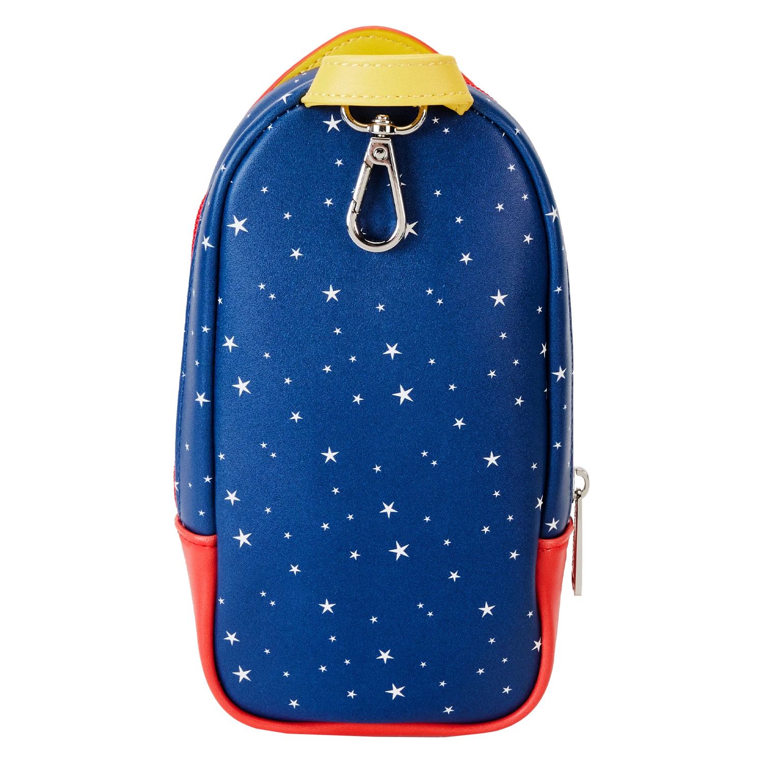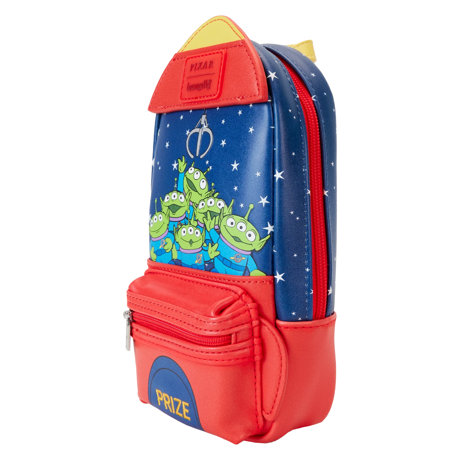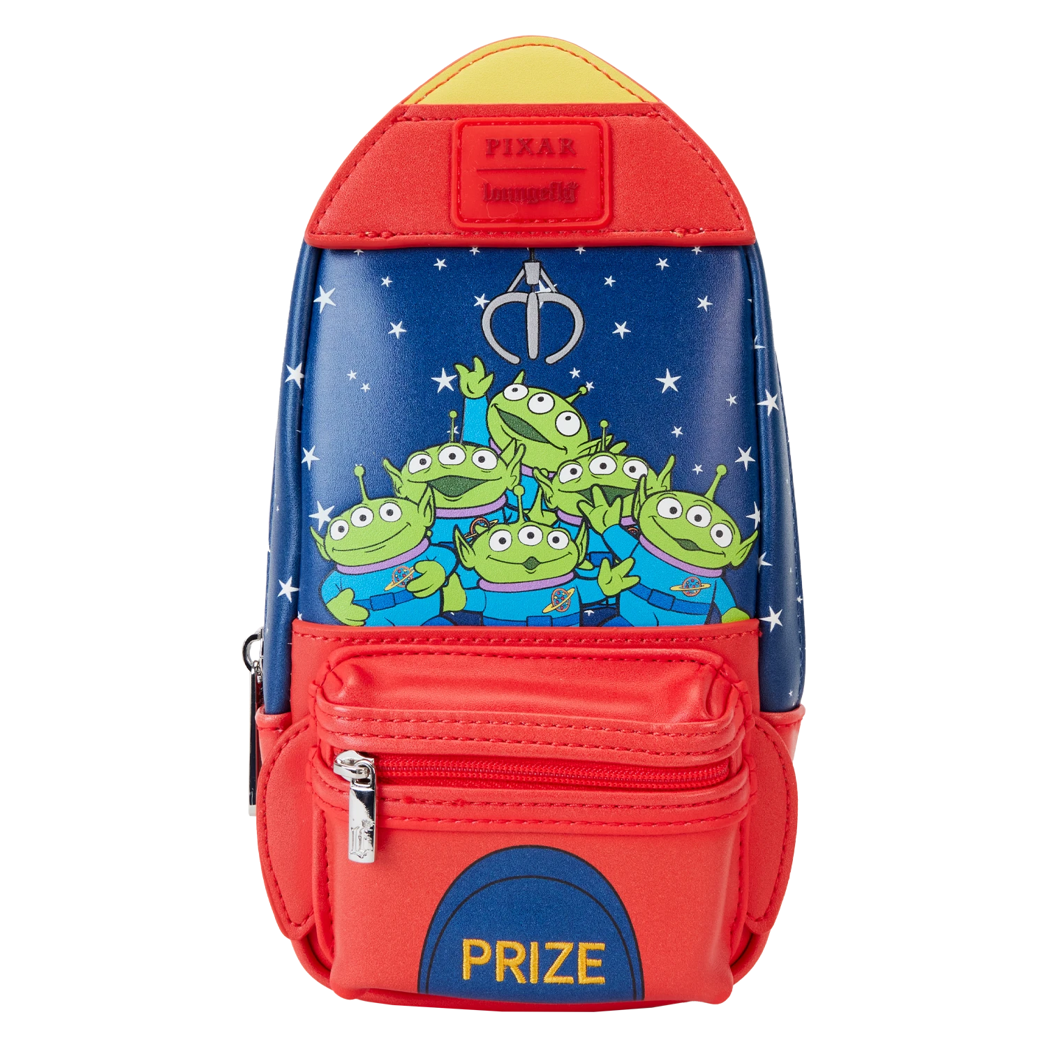 Oooooo! The Loungefly Toy Story Aliens Claw Machine Pencil Case takes your next adventure out of this world. Inspired by the Pizza Planet arcade game, this pencil case gives shape to a red rocket ship. On the front, a claw crane dangles above a group of alien toys while the game’s prize drawer appears on the zipper pocket below. A starry background continues onto the back of the case, and a durable lobster clip makes it easy to carry your important items with you. This pencil case has room for all your playdate essentials and is the perfect accessory for kids at heart.